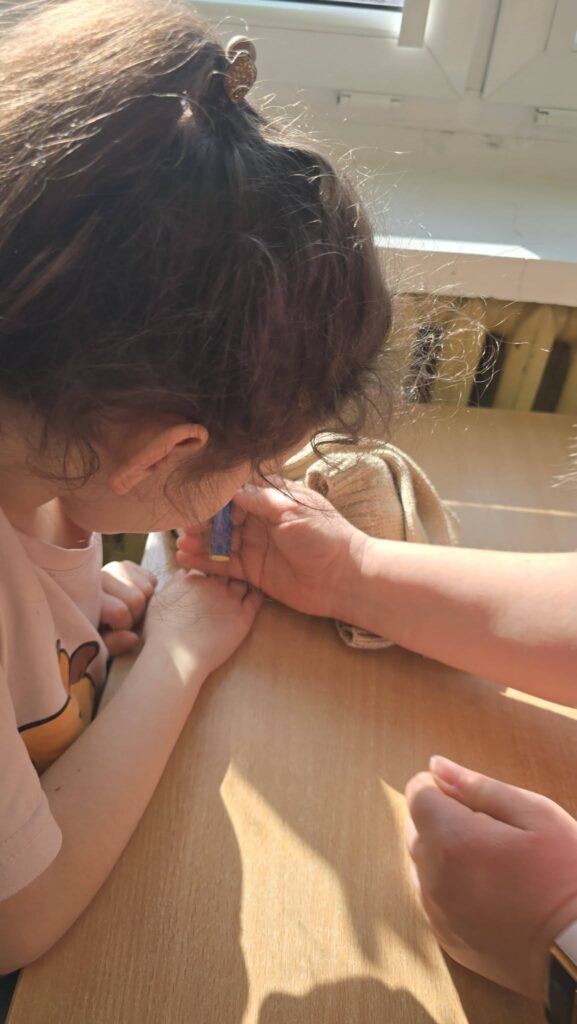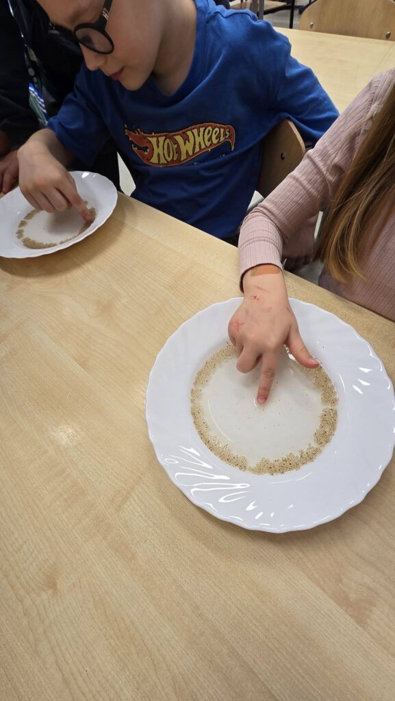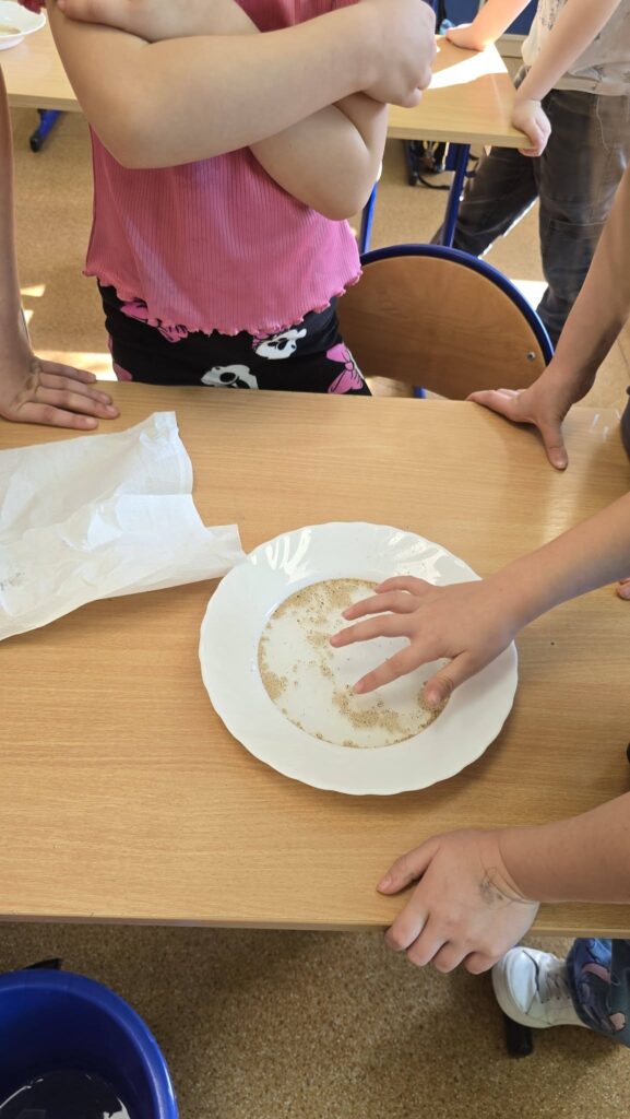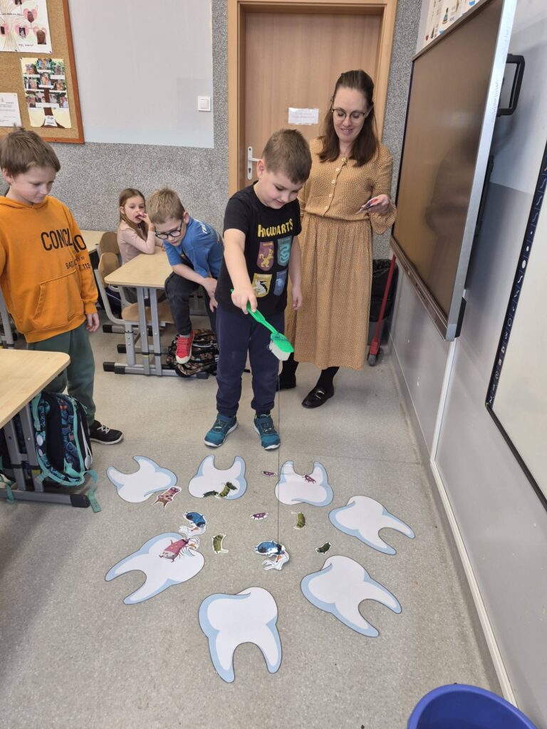 Dzieci z zaciekawieniem wysłuchały historii a potem dzięki długopisom UV przekonały się, że bakterii nie widać, ale naprawdę istnieją. Były też ciekawe doświadczenia z pieprzem i mydłem oraz „wyławianie bakterii z zębów” szczoteczką i magnesem.