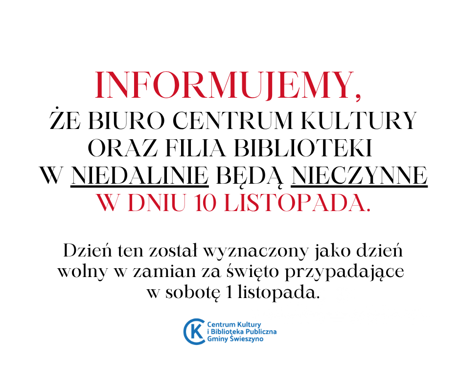 Biuro Centrum Kultury i Filia Biblioteczna w Niedalinie nieczynne 10 listopada Izabela Janczak 4 tygodnie ago