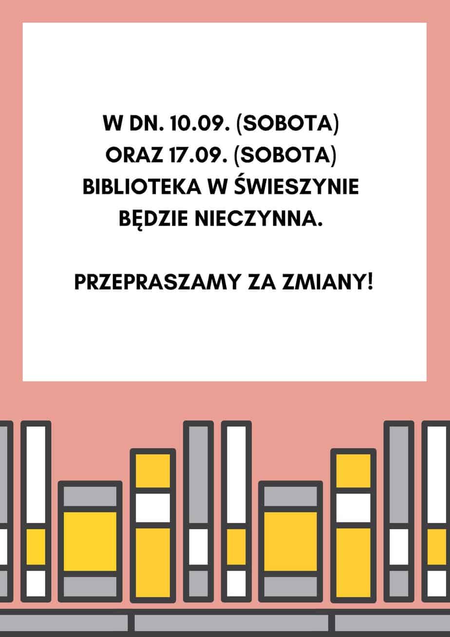 Drogie Czytelniczki, drodzy Czytelnicy, informujemy, że Biblioteka Publiczna w Świeszynie będzie nieczynna w soboty: 10 oraz 17 września. Przepraszamy za zmiany!...