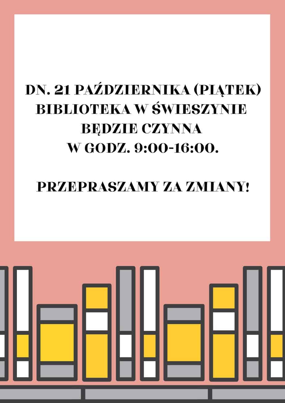 21 października (piątek) Biblioteka w Świeszynie będzie czynna w godzinach 9:00-16:00. Przepraszamy za zmiany!...