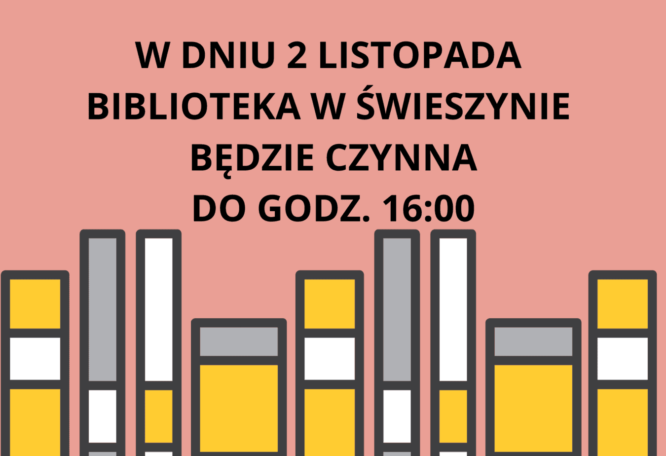 Drogie Czytelniczki, Drodzy Czytelnicy! Informujemy, że w dniu 2 listopada Biblioteka w Świeszynie będzie czynna do godz. 16:00. Przepraszamy za zmiany!...
