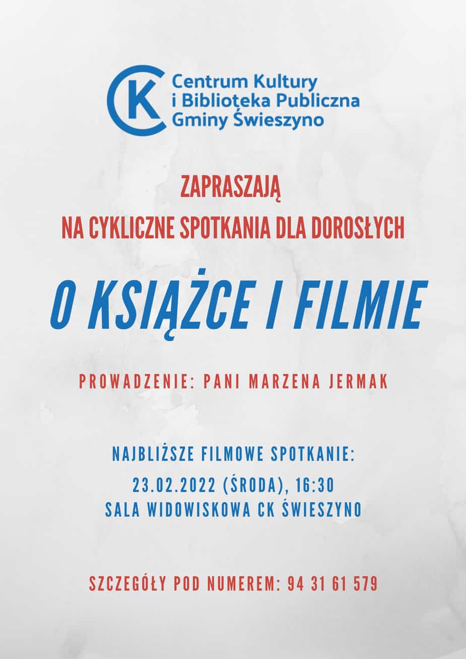 Serdecznie zapraszamy, tym razem na filmowe, spotkanie dla dorosłych z cyklu O książce i filmie, które odbędzie się 23 lutego o godzinie 16:30 w sali widowiskowej CK Świeszyno. Spotkanie poprowadzi Pa...