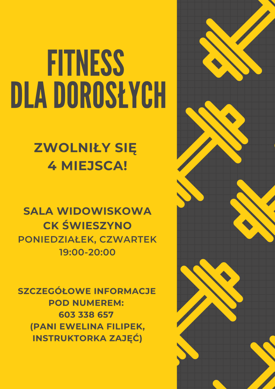 Zwolniły się cztery miejsca na fitness dla dorosłych. Zajęcia odbywają się w poniedziałki i czwartki w godzinach 19:00-20:00. Szczegółowe informacje i zapisy pod numerem telefonu: 603 338 657 (Pani Ew...