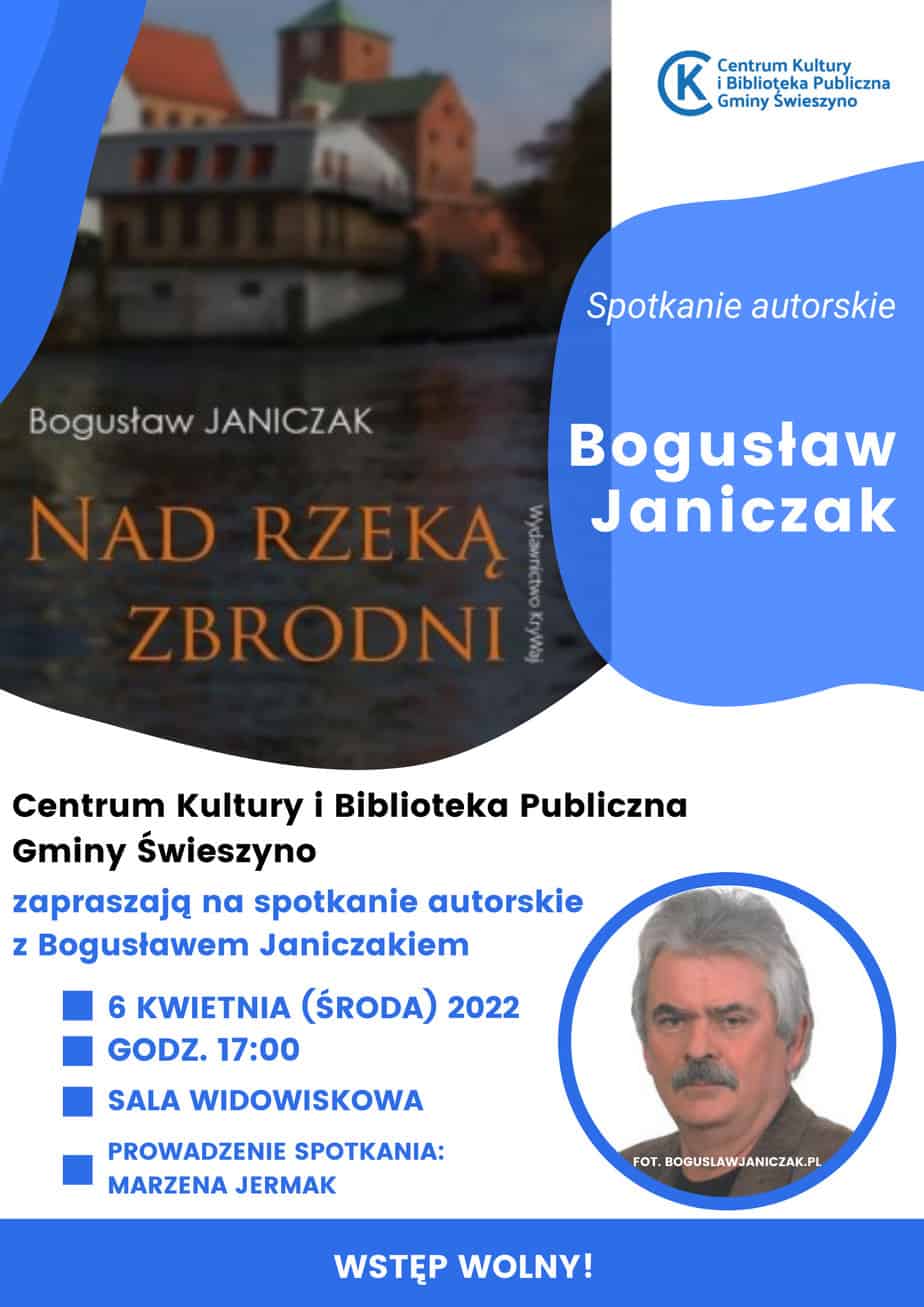 Serdecznie zapraszamy na spotkanie autorskie z Panem Bogusławem Janiczakiem, poetą, prozaikiem, marynistą. Spotkanie odbędzie się 6 kwietnia o godzinie 17:00 w sali widowiskowej CK Świeszyno. Poprowad...