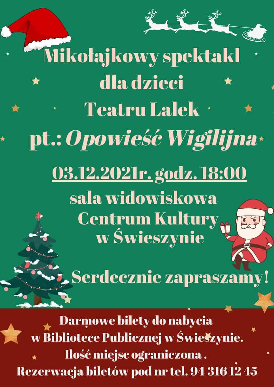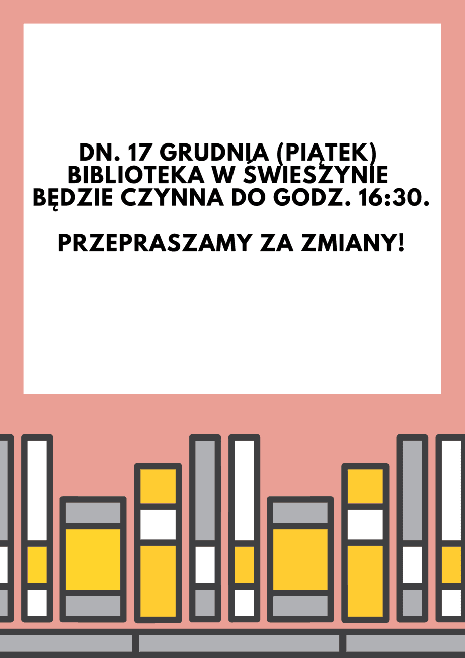 Dn. 17 grudnia (piątek) Biblioteka w Świeszynie będzie czynna w godzinach 12:00-16:30. Tego dnia o godz. 16:45 na sali widowiskowej rozpocznie się fantastyczny spektakl teatralny Bałtyckiego Teatru Dr...