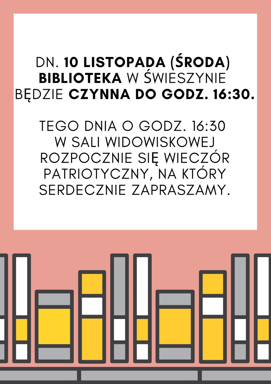 Serdecznie przypominamy, że 10 listopada (środa) Biblioteka w Świeszynie będzie czynna do godziny 16:30. O godzinie 16:30 w sali widowiskowej rozpocznie się Wieczór Patriotyczny, na który serdecznie z...