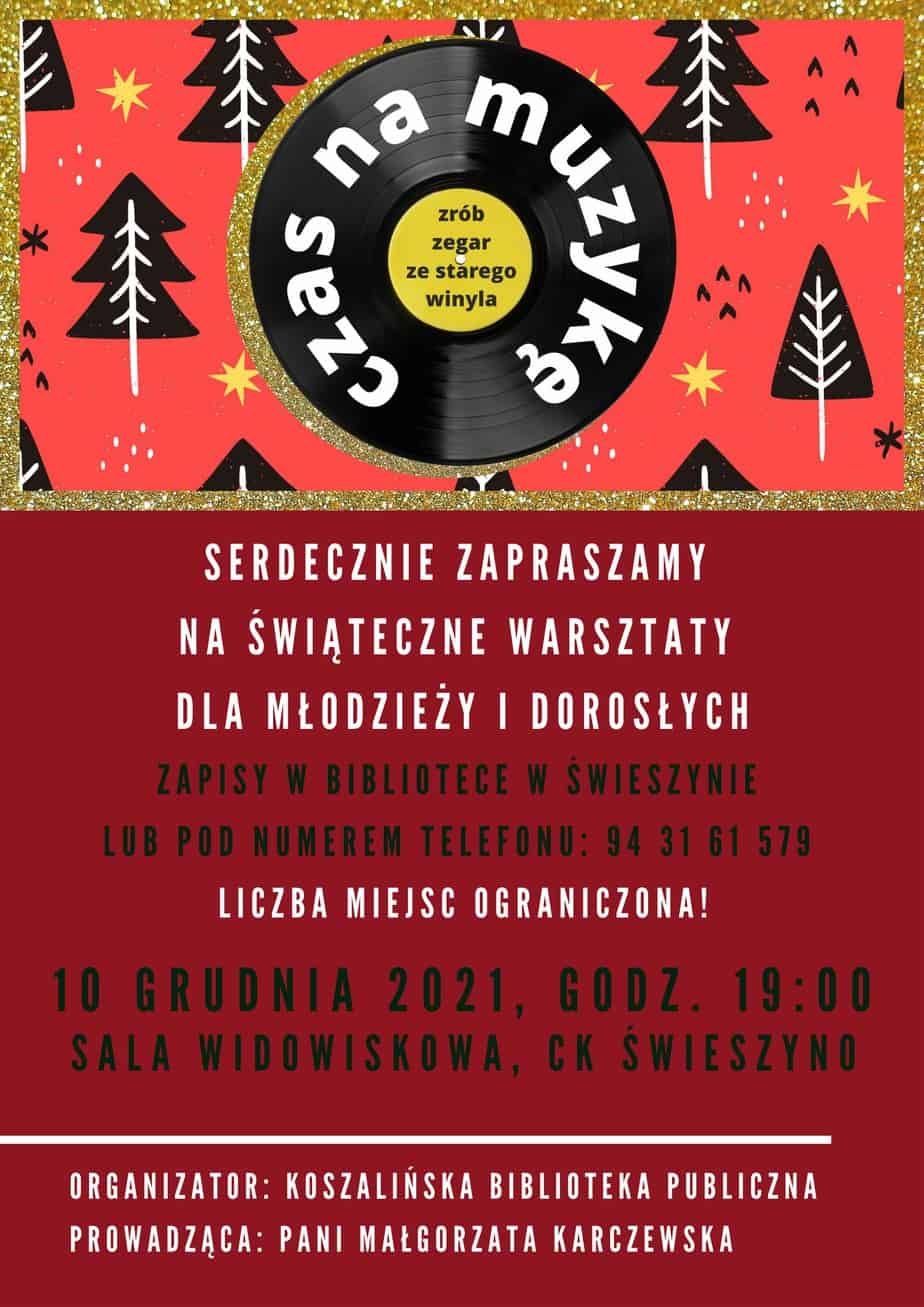 Serdecznie zapraszamy na świąteczne warsztaty kreatywne DLA MŁODZIEŻY I DOROSŁYCH pn. CZAS NA MUZYKĘ. Zegar ze starego winyla? Czy to nie brzmi fantastycznie? Dzięki Koszalińskiej Bibliotece Publiczne...