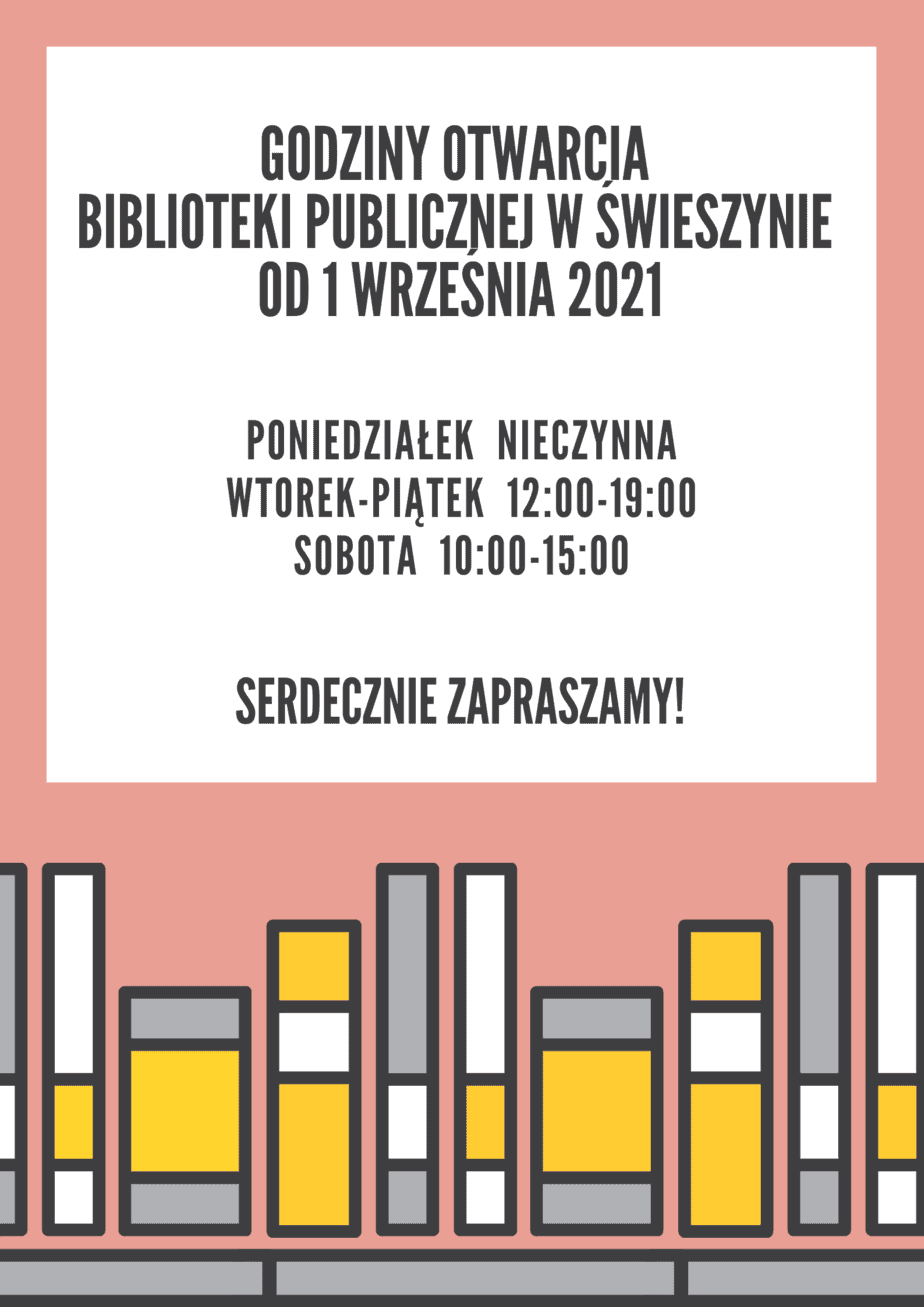Serdecznie zapraszamy do Filii Bibliotecznej w Niedalinie, która będzie czynna od dn. 27 września według następującego harmonogramu: poniedziałek 12:00 – 19:00 piątek 12:00-19:00 Zapraszamy!...