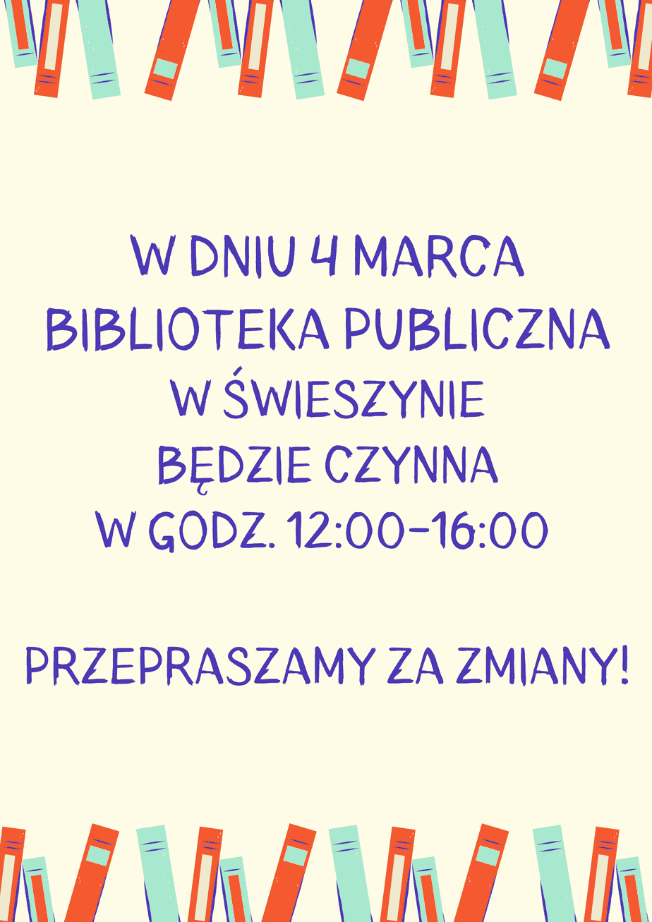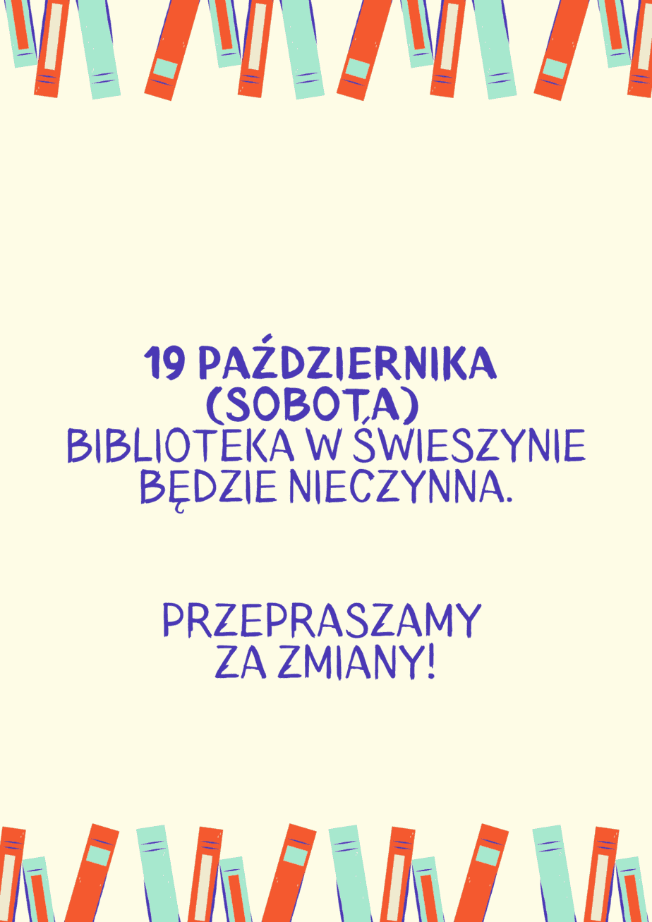 Drogie Czytelniczki, Drodzy Czytelnicy! Informujemy, o zmianach w funkcjonowaniu naszych bibliotek w okresie świątecznym. Biblioteka w Świeszynie będzie nieczynna w dniach: 21.12. 24.12. 28.12. 31.12....