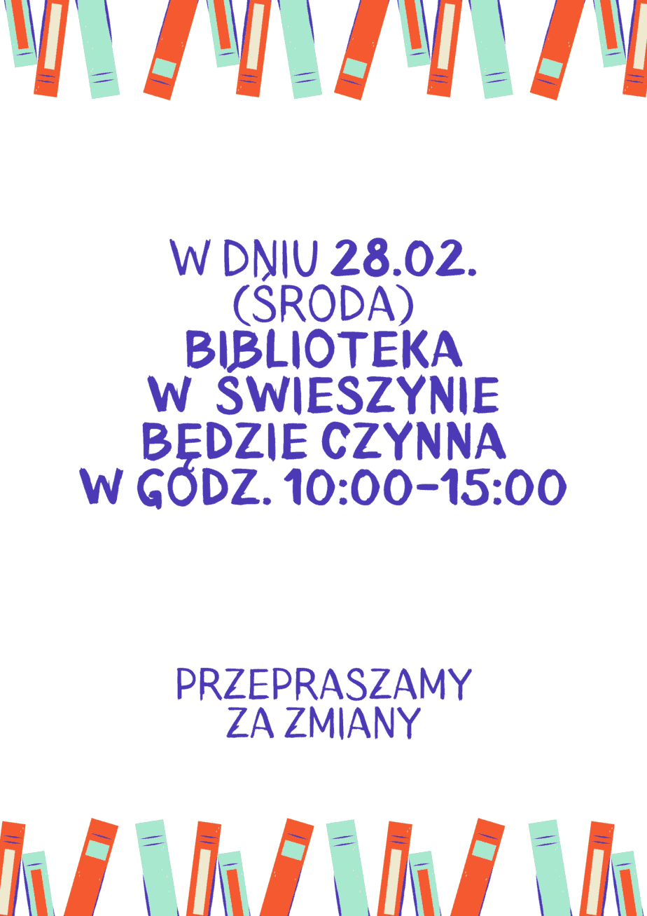 Drogie Czytelniczki, Drodzy Czytelnicy! Informujemy, że w dniu 28.02. (środa) Biblioteka w Świeszynie będzie czynna w godz. 10:00-15:00. Przepraszamy za zmiany!...