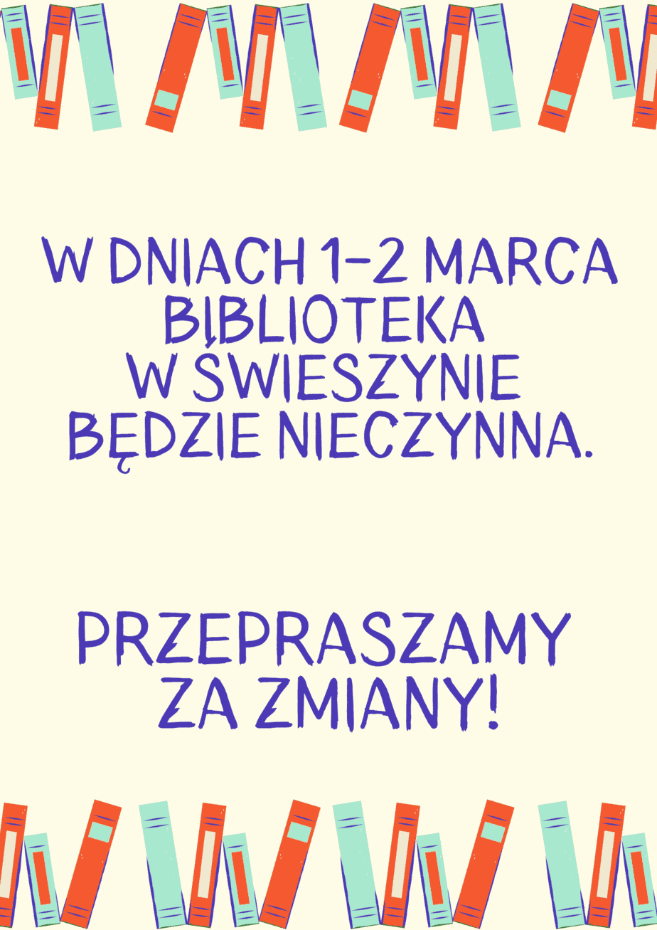 Drogie Czytelniczki, Drodzy Czytelnicy! Informujemy, że w dniach 1 i 2 marca Biblioteka w Świeszynie będzie nieczynna. Przepraszamy za zmiany!...