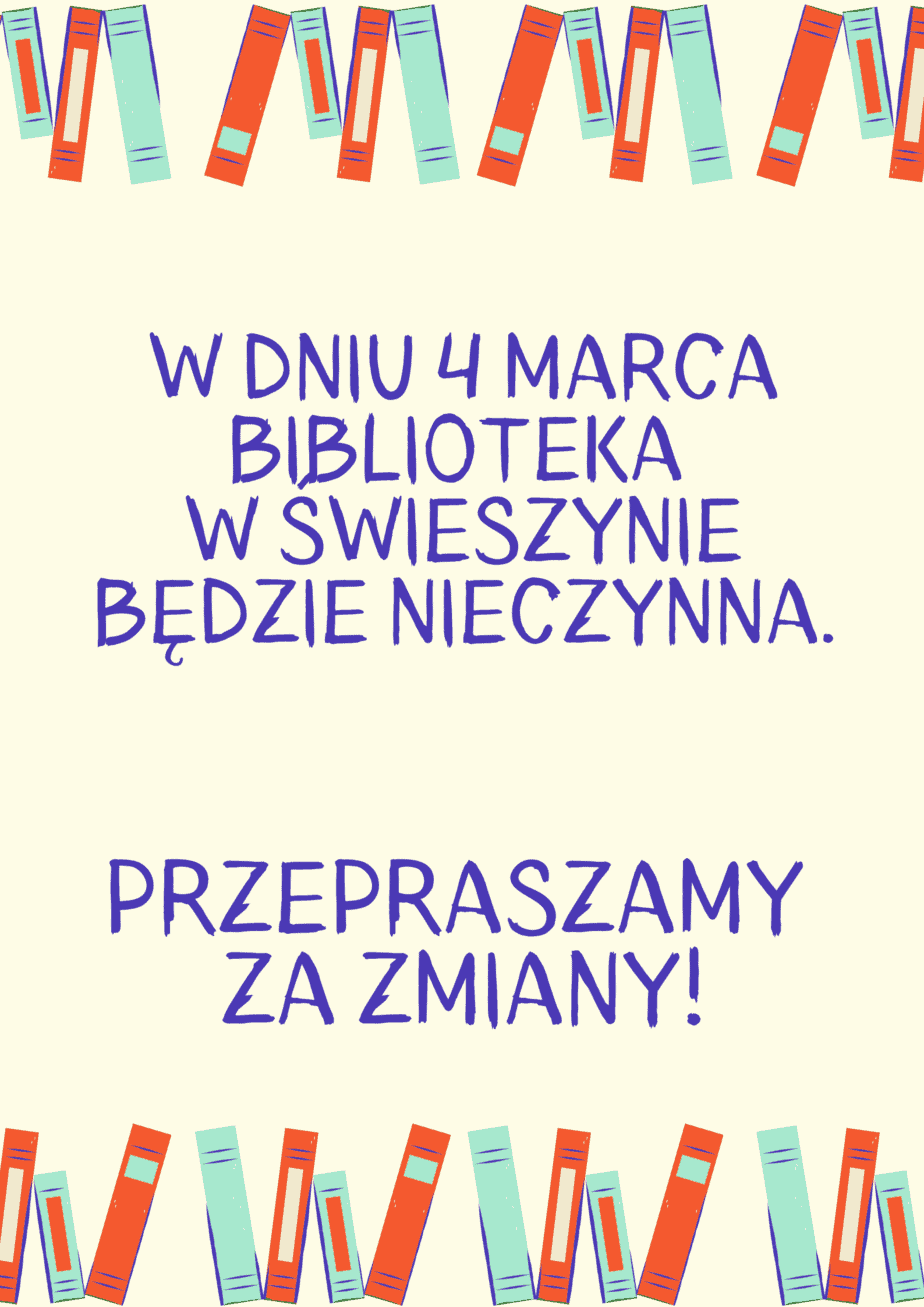 Drogie Czytelniczki, Drodzy Czytelnicy! Informujemy, że w dniu 4 marca Biblioteka w Świeszynie będzie nieczynna. Przepraszamy za zmiany!...