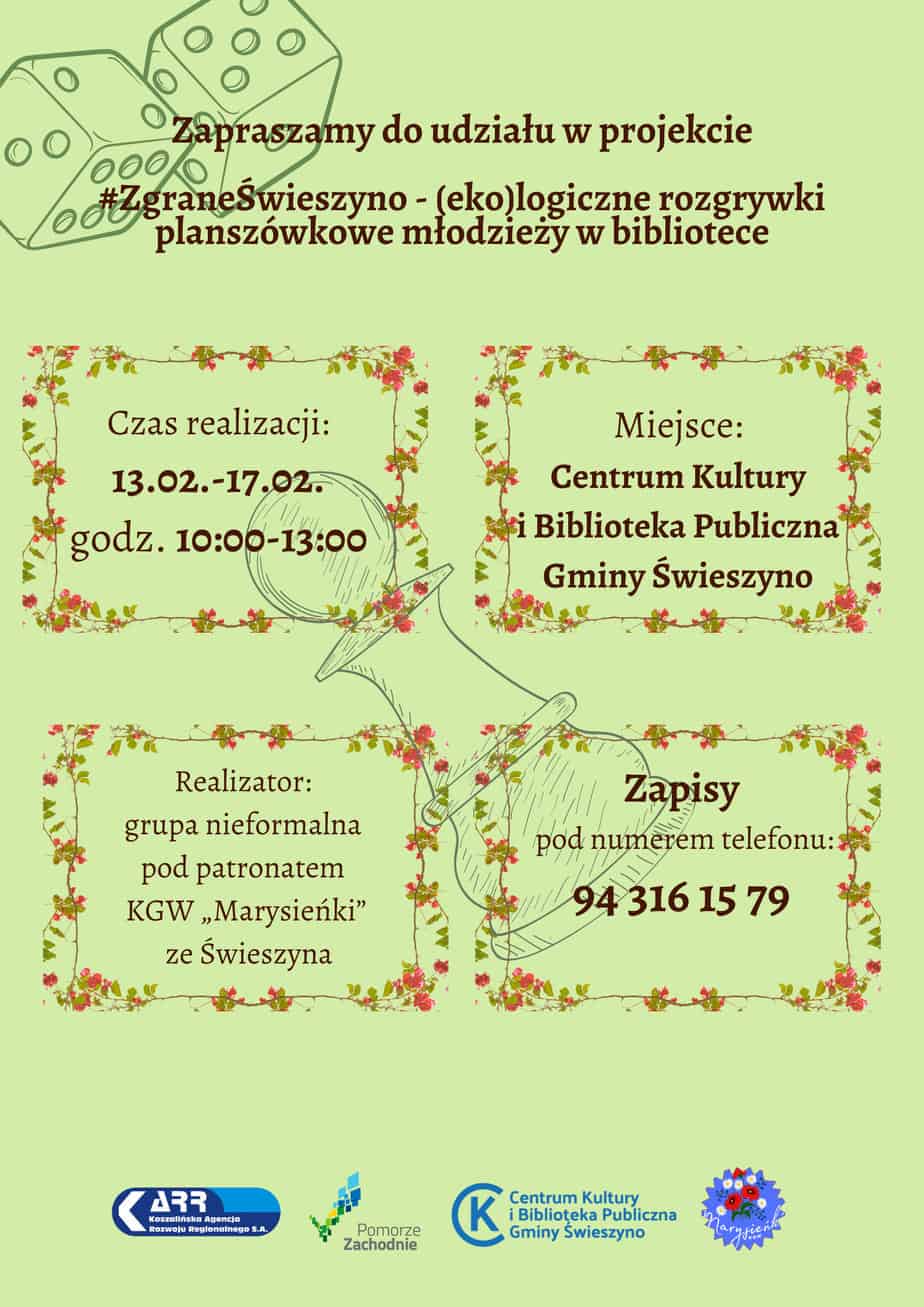 Zapraszamy do udziału w projekcie #ZgraneŚwieszyno – (eko)logiczne rozgrywki planszówkowe młodzieży w bibliotece. Czas realizacji: 13-17 luty 2023, godz. 10:00-13:00 Miejsce: Centrum Kultury i Bibliot...