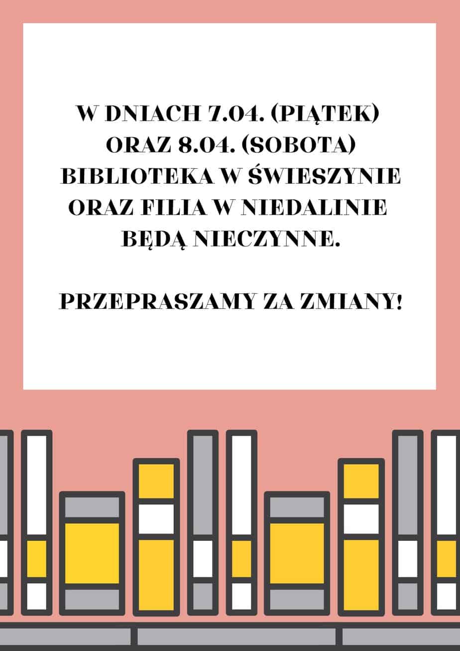 W dniach 7.04. (piątek) oraz 8.04. (sobota) nasze placówki biblioteczne w Świeszynie i Niedalinie będą nieczynne. Przepraszamy za zmiany....