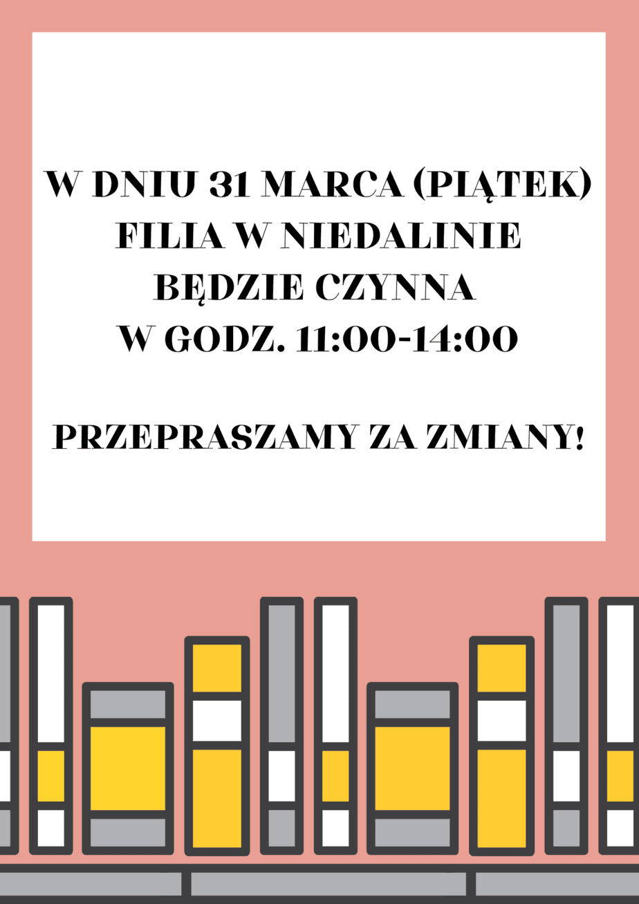 Drogie Czytelniczki, Drodzy Czytelnicy! Informujemy, że w dniu 31 marca (piątek) Filia w Niedalinie będzie czynna w godz. 11:00-14:00. Przepraszamy za zmiany!...