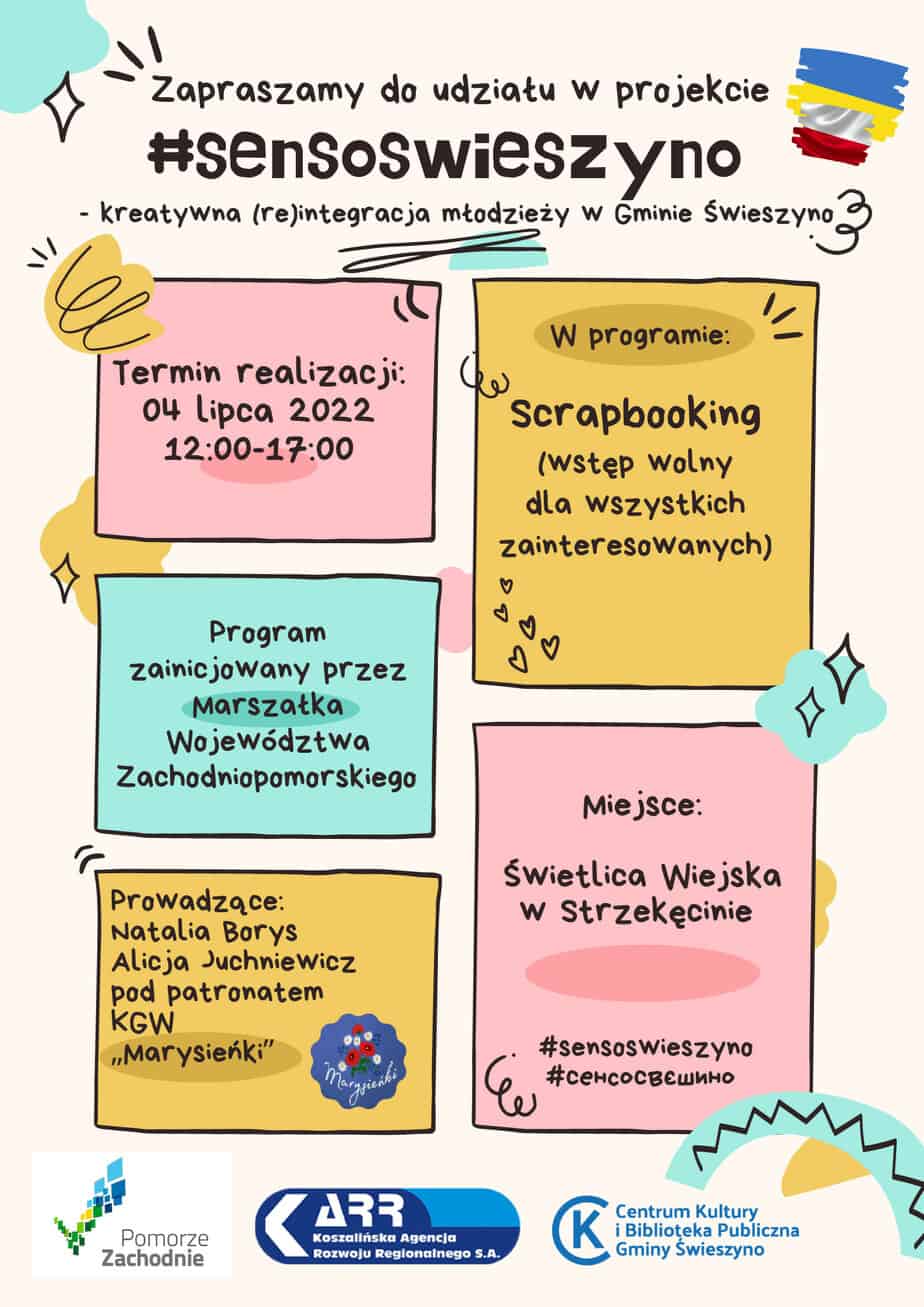 Serdecznie zapraszamy dzieci i młodzież na warsztaty ze Scrapbookingu , które organizuje i realizuje grupa nieformalna pod patronatem KGW „Marysieńki” w ramach projektu: #sensoswieszyno – kreaty...
