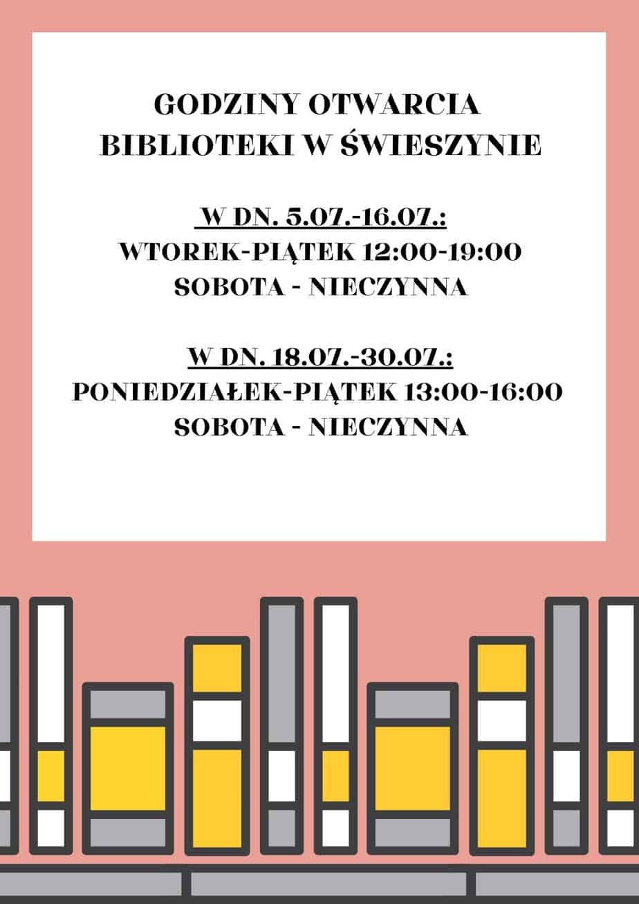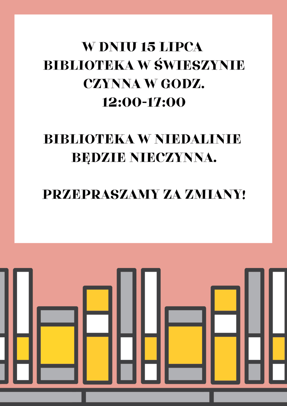 Drogie Czytelniczki, Drodzy Czytelnicy! Informujemy, że 15 lipca (piątek) Biblioteka w Świeszynie będzie czynna w godz. 12:00-17:00. W tym dniu Filia Biblioteczna w Niedalinie będzie nieczynna. Przepr...