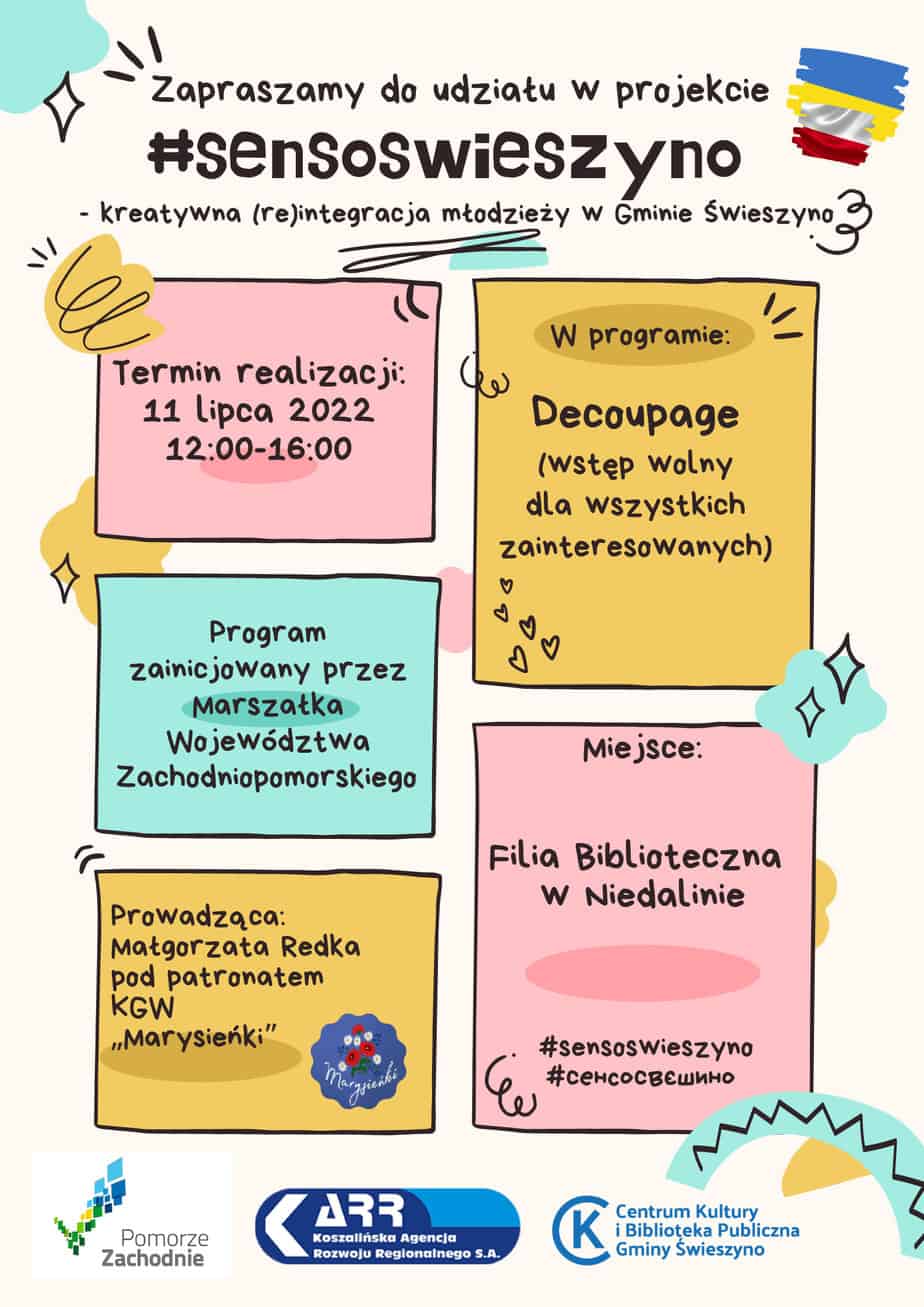 Serdecznie zapraszamy dzieci i młodzież na warsztaty z Decoupage, które organizuje i realizuje grupa nieformalna pod patronatem KGW „Marysieńki” w ramach projektu: #sensoswieszyno – kreatywna (r...