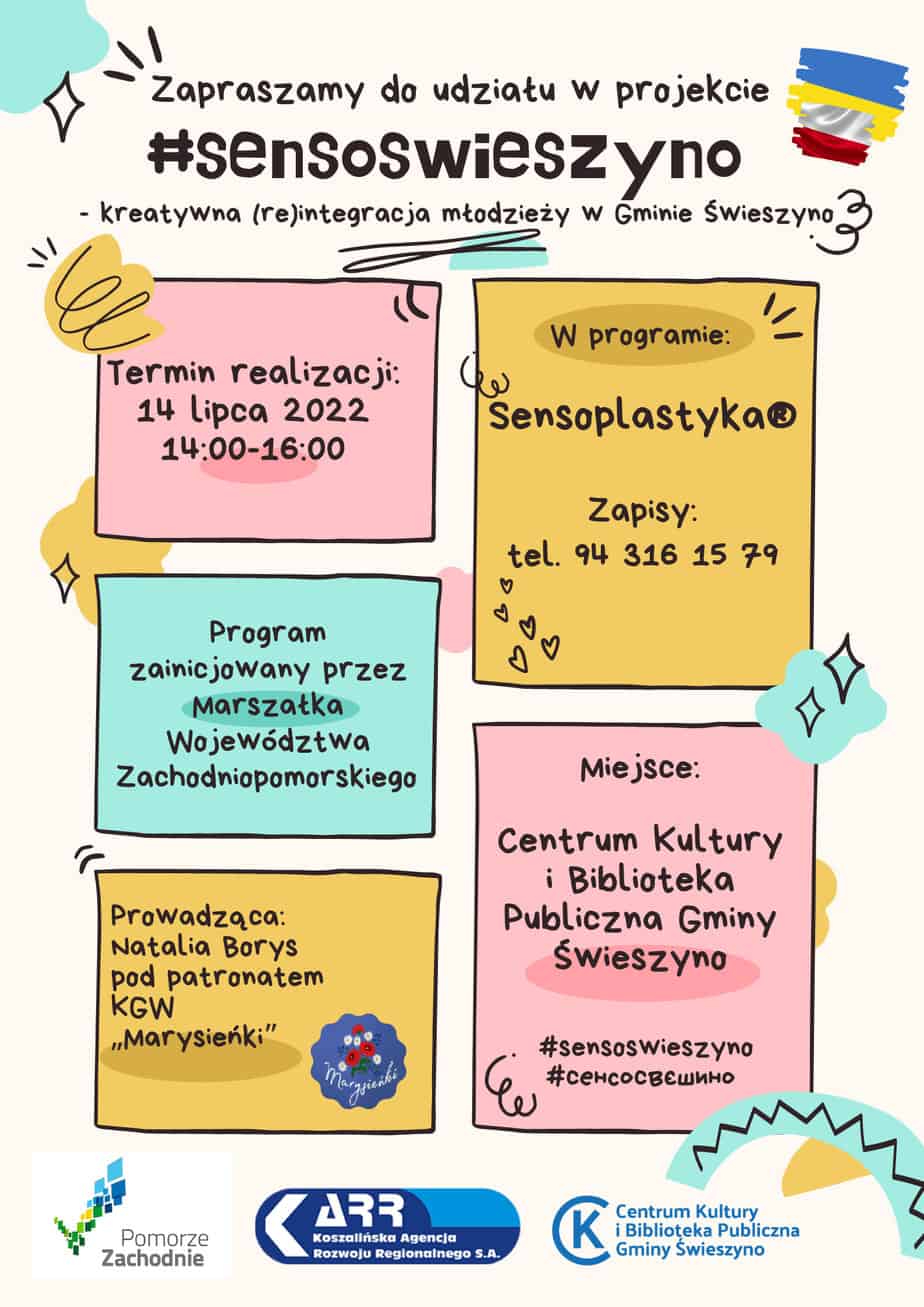 Serdecznie zapraszamy dzieci i młodzież do zapisów na Sensoplastykę®, która odbędzie się 14 lipca (czwartek) w godz. 14:00-16:00, na terenie zielonym przy Centrum Kultury i Bibliotece Publicznej Gminy...