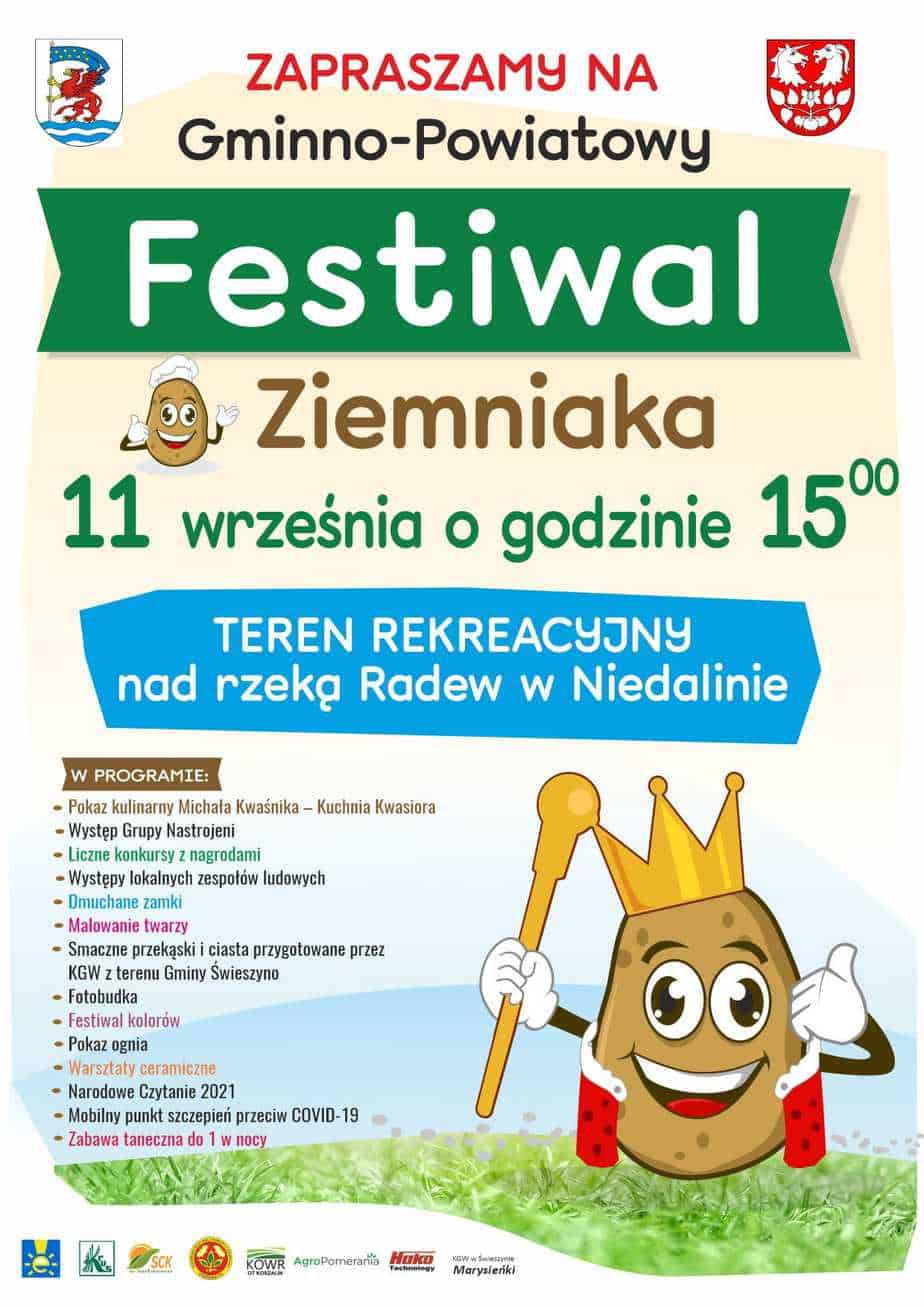 Serdecznie zapraszamy na Gminno-Powiatowy Festiwal Ziemniaka, który odbędzie się 11 września na terenie rekreacyjnym nad rzeką Radew w Niedalinie. W programie: pokaz kulinarny Kwasiora, występy grupy ...