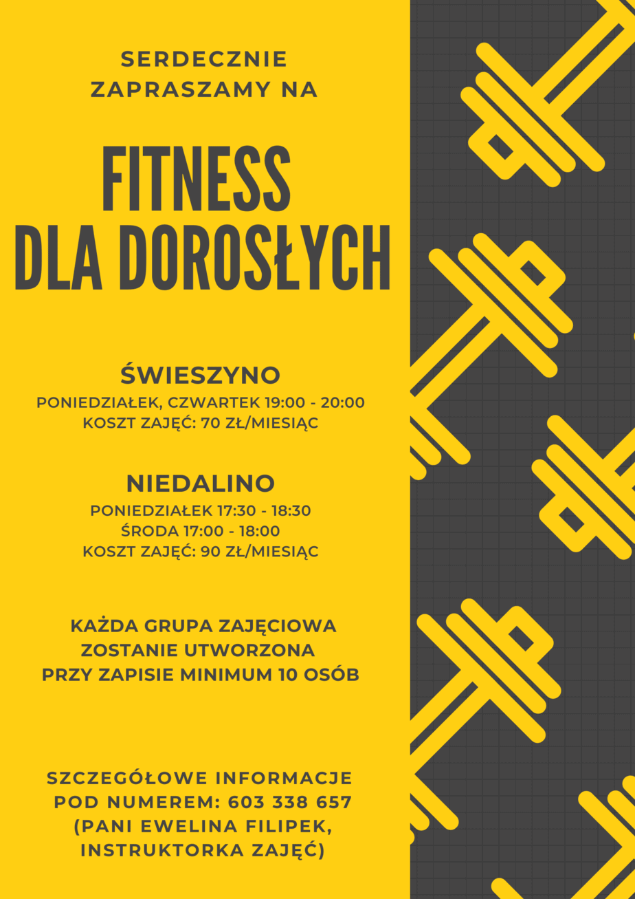 Serdecznie zapraszamy do zapisów na zajęcia fitnessu dla dorosłych. Wszelkich informacji udziela Pani Ewelina Filipek, prowadząca zajęcia, pod numerem telefonu: 603 338 657....