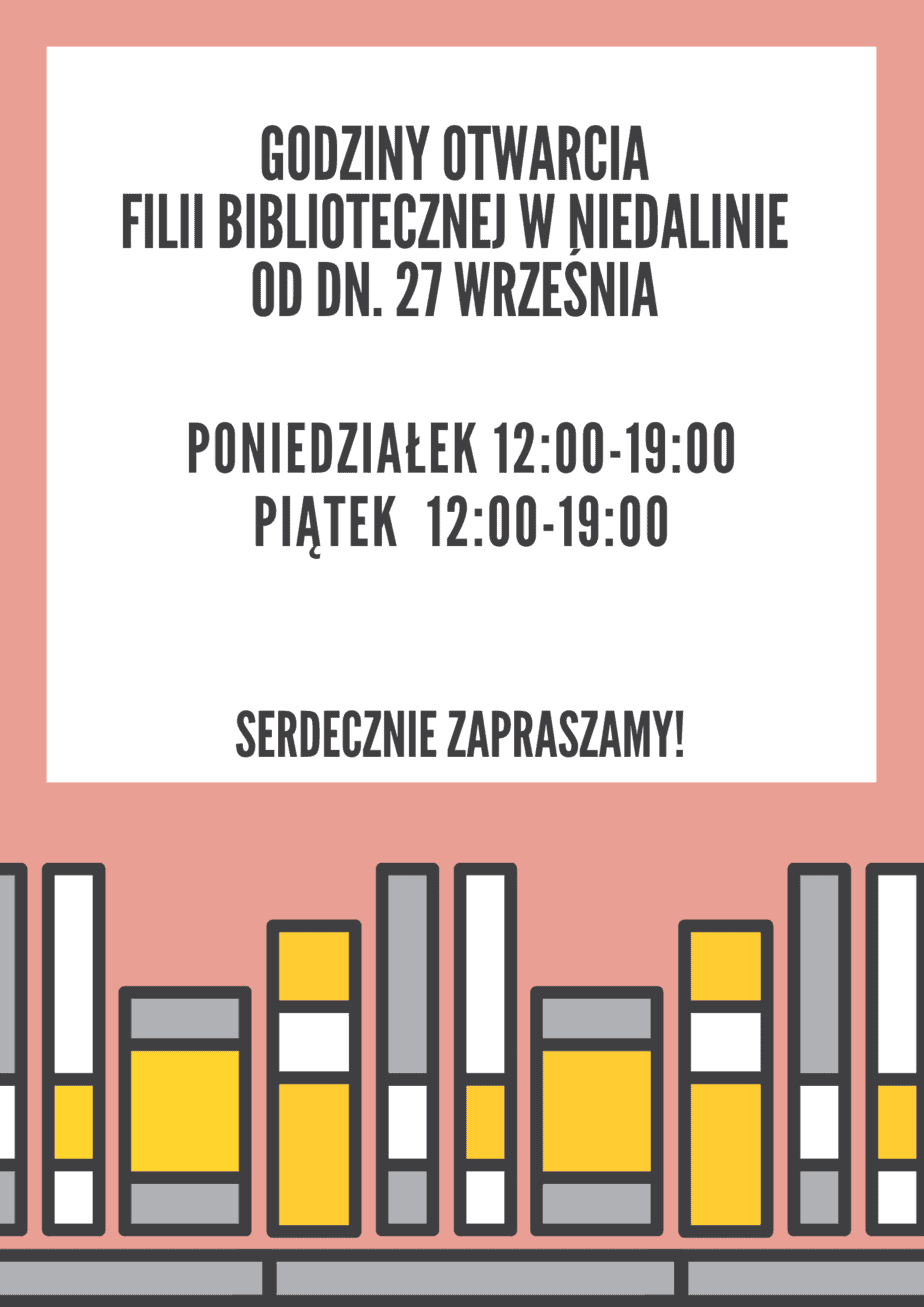 Serdecznie zapraszamy do Filii Bibliotecznej w Niedalinie, która będzie czynna od dn. 27 września według następującego harmonogramu: poniedziałek 12:00 – 19:00 piątek 12:00-19:00 Zapraszamy!...