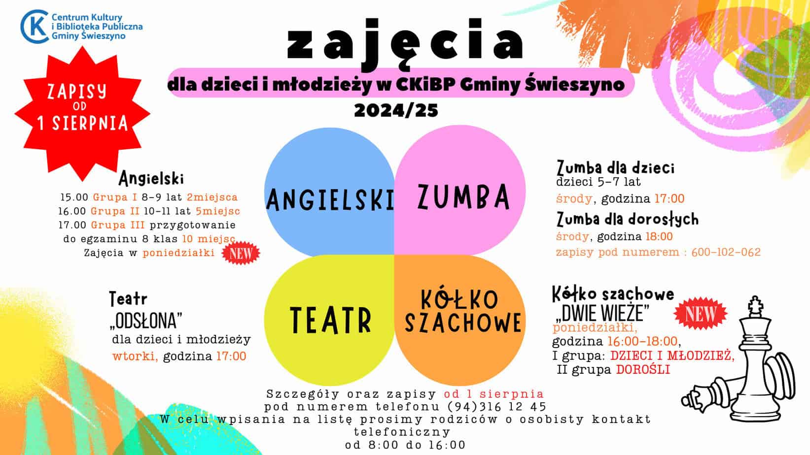 Zachęcamy do skorzystania z oferty Centrum Kultury i Biblioteki Publicznej Gminy Świeszyno. Szczegółowe informacje oraz zapisy są dostępne pod numerem 94 316 12 45....