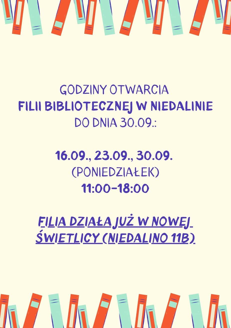 Godziny otwarcia Filii Bibliotecznej w Niedalinie do dnia 30.09.: 16.09., 23.09., 30.09. (tylko poniedziałki) – 11:00-18:00 Filia działa już w nowym centrum społeczno-rekreacyjnym (Niedalino 11b...