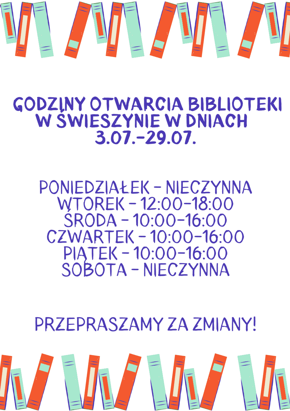 Drogie Czytelniczki, Drodzy Czytelnicy! Informujemy o zmianach w funkcjonowaniu naszych bibliotek w dniach 31.07.-12.08.: ŚWIESZYNO poniedziałek-piątek – 14:00-16:00 sobota – nieczynne 9.0...