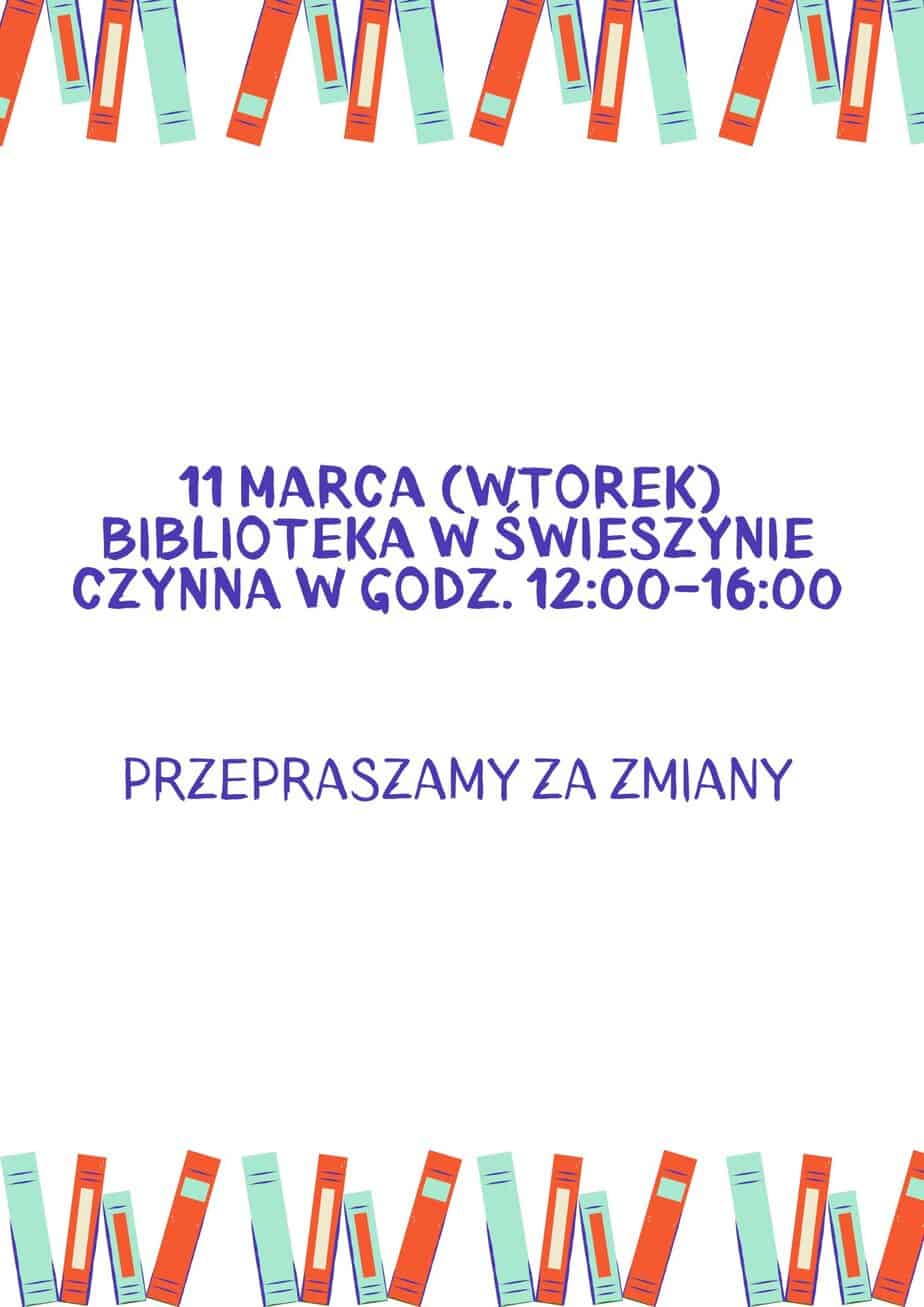 Informujemy, że 11 marca (wtorek) Biblioteka w Świeszynie będzie czynna w godzinach 12:00-16:00. Przepraszamy za zmiany....