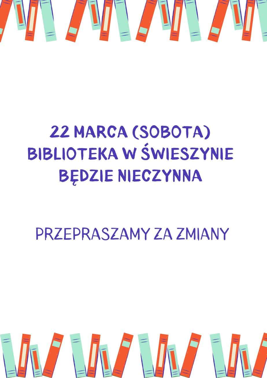 Informujemy, że Biblioteka w Świeszynie będzie nieczynna 22 marca (sobota). Przepraszamy za zmiany....