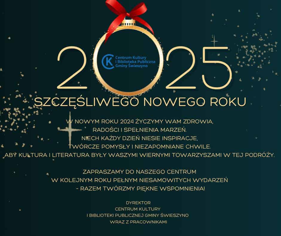 Drogie Czytelniczki, Drodzy Czytelnicy! Informujemy, o zmianach w funkcjonowaniu naszych bibliotek w okresie świątecznym. Biblioteka w Świeszynie będzie nieczynna w dniach: 21.12. 24.12. 28.12. 31.12....