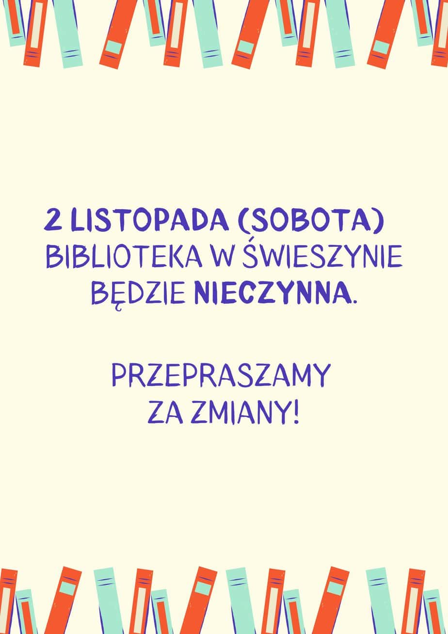 Informujemy, że 2 listopada (sobota) Biblioteka w Świeszynie będzie nieczynna. Przepraszamy za zmiany....