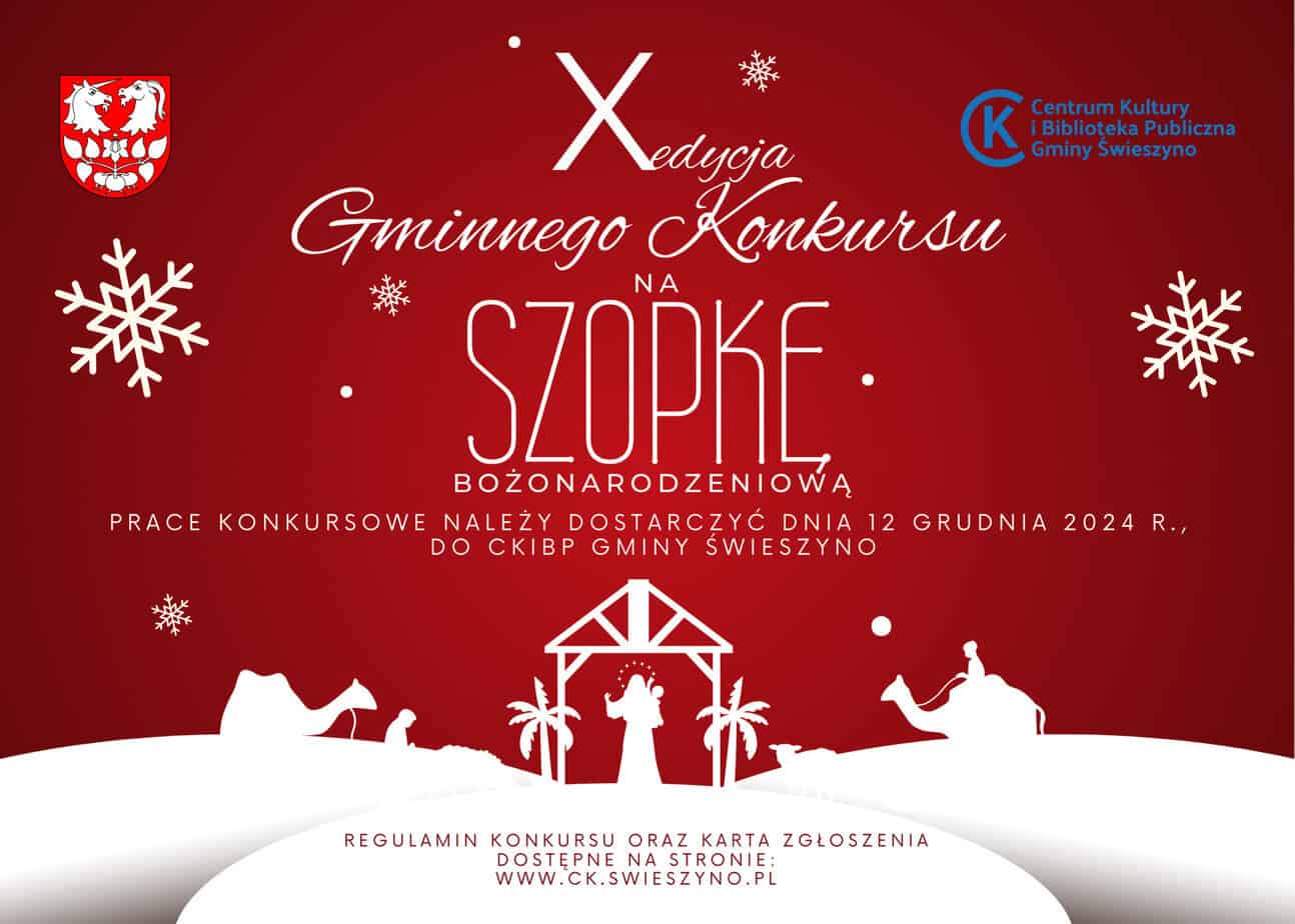 Centrum Kultury i Biblioteka Publiczna Gminy Świeszyno ogłasza X edycję Gminnego Konkursu na Szopkę Bożonarodzeniową oraz zaprasza do udziału. Konkurs skierowany jest do dzieci i młodzieży, dorosłych,...