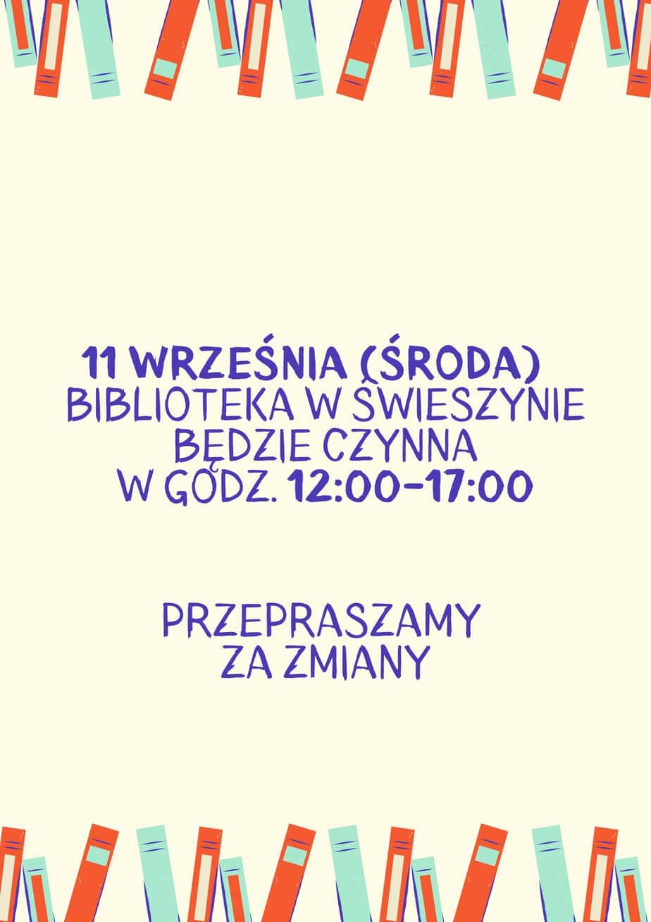 11 września (środa) Biblioteka w Świeszynie będzie czynna w godzinach 12:00-17:00. Przepraszamy za zmiany....