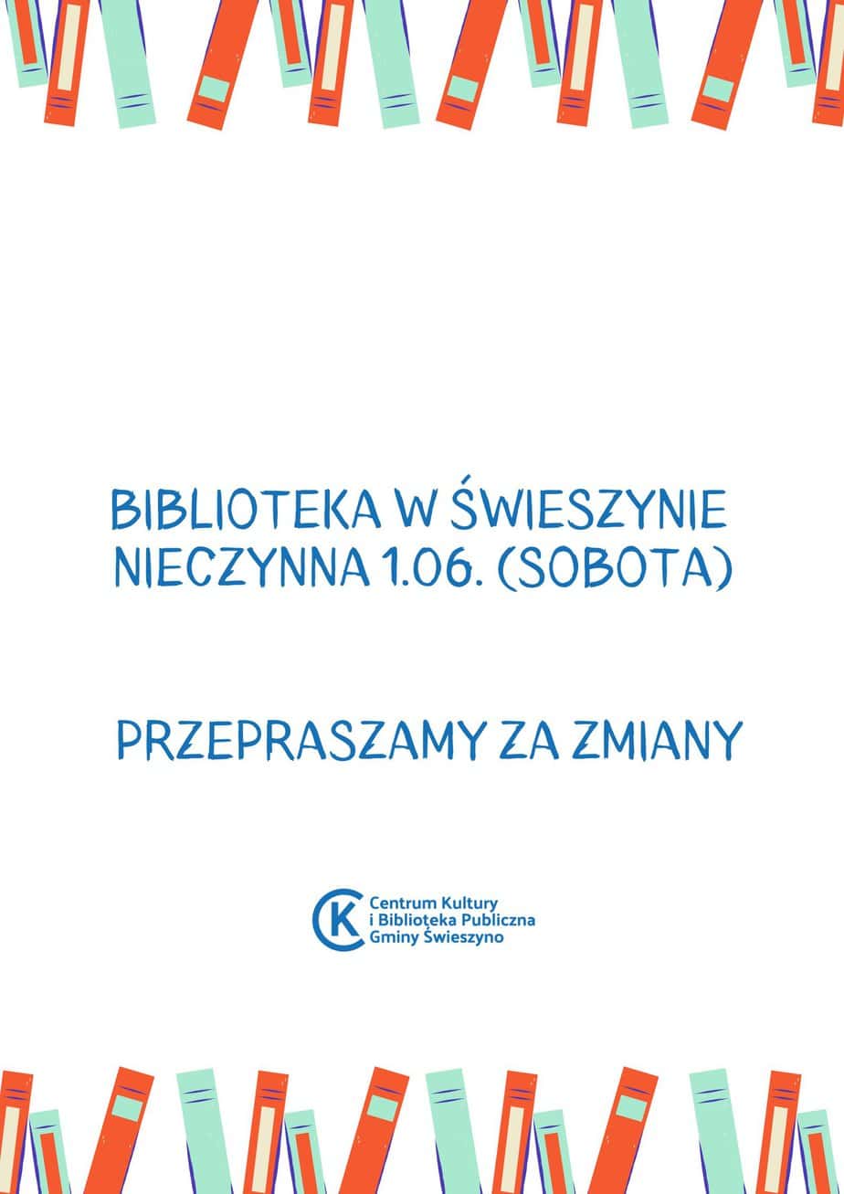 Biblioteka w Świeszynie będzie nieczynna 1.06. (sobota) w związku z organizacją Gminnego Dnia Dziecka. Przepraszamy za zmiany....