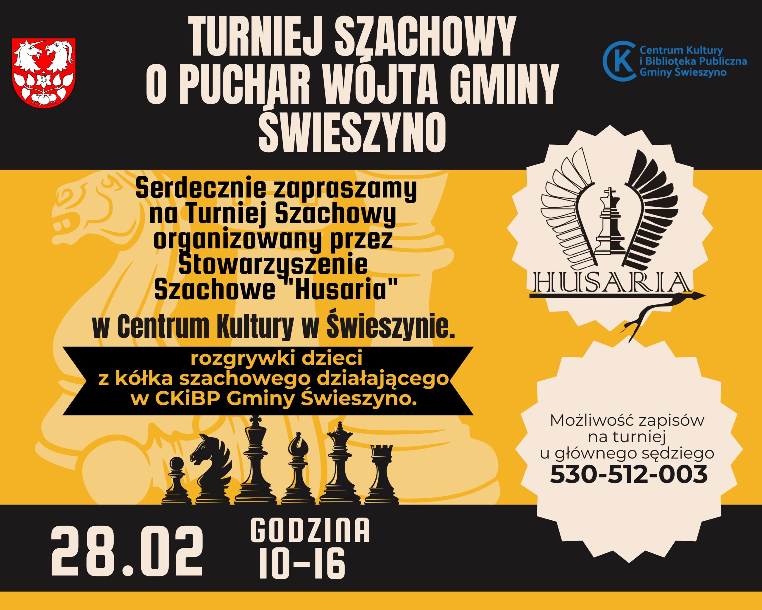 Serdecznie zapraszamy na wyjątkowe szachowe wydarzenie organizowane przez Stowarzyszenie Szachowe „Husaria” we współpracy z Centrum Kultury i Biblioteka Publiczna Gminy Świeszyno. 28 lutego Godzina 10...