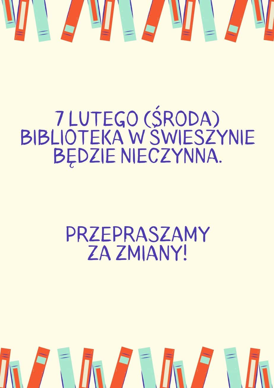 Informujemy, że 7 lutego (środa) Biblioteka w Świeszynie będzie nieczynna. Tego dnia bibliotekarki będą brały udział w powiatowej konferencji w Koszalińskiej Bibliotece Publicznej....