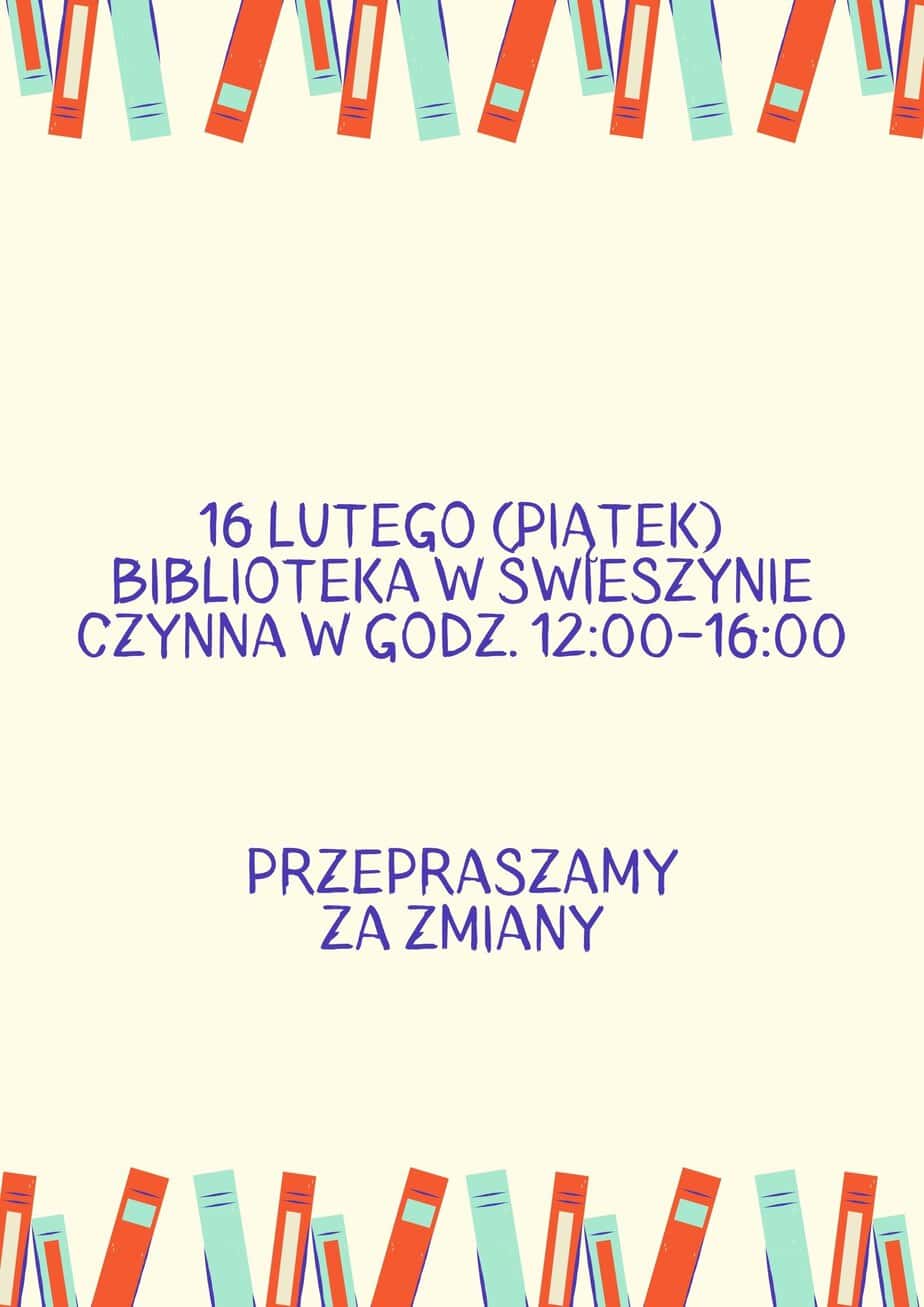 Informujemy, że 16.02. (piątek) Biblioteka w Świeszynie będzie czynna w godz. 12:00-16:00. Przepraszamy za zmiany....