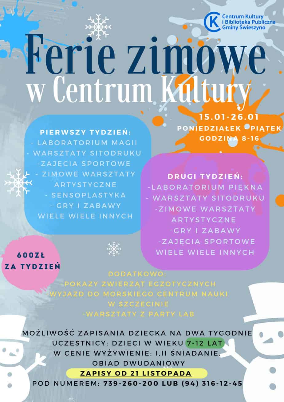 Regulamin półkolonii zimowej dostępny poniżej, karty kwalifikacyjne zapisanych dzieci dostępne w biurze Centrum Kultury w Świeszynie. Zapraszamy....