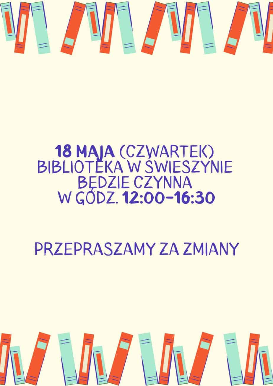 18 maja (czwartek) Biblioteka Publiczna w Świeszynie będzie czynna w godzinach 12:00-16:30. Przepraszamy za zmiany....