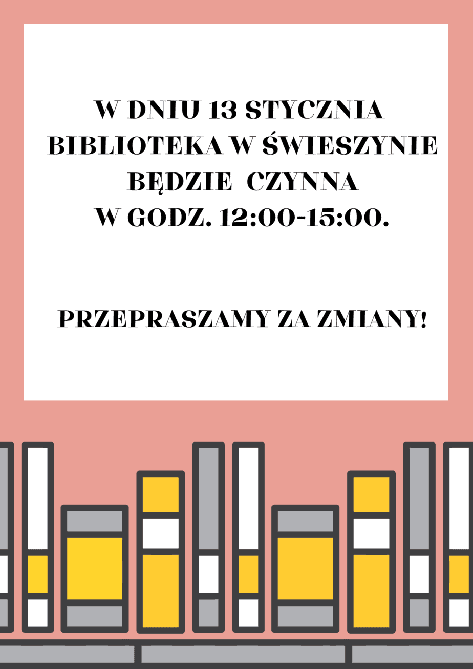 Informujemy, że 13 stycznia Biblioteka w Świeszynie będzie czynna w godzinach 12:00-15:00. Tego dnia o godzinie 16:00 rozpocznie się Koncert Noworoczny, na który serdecznie zapraszamy....