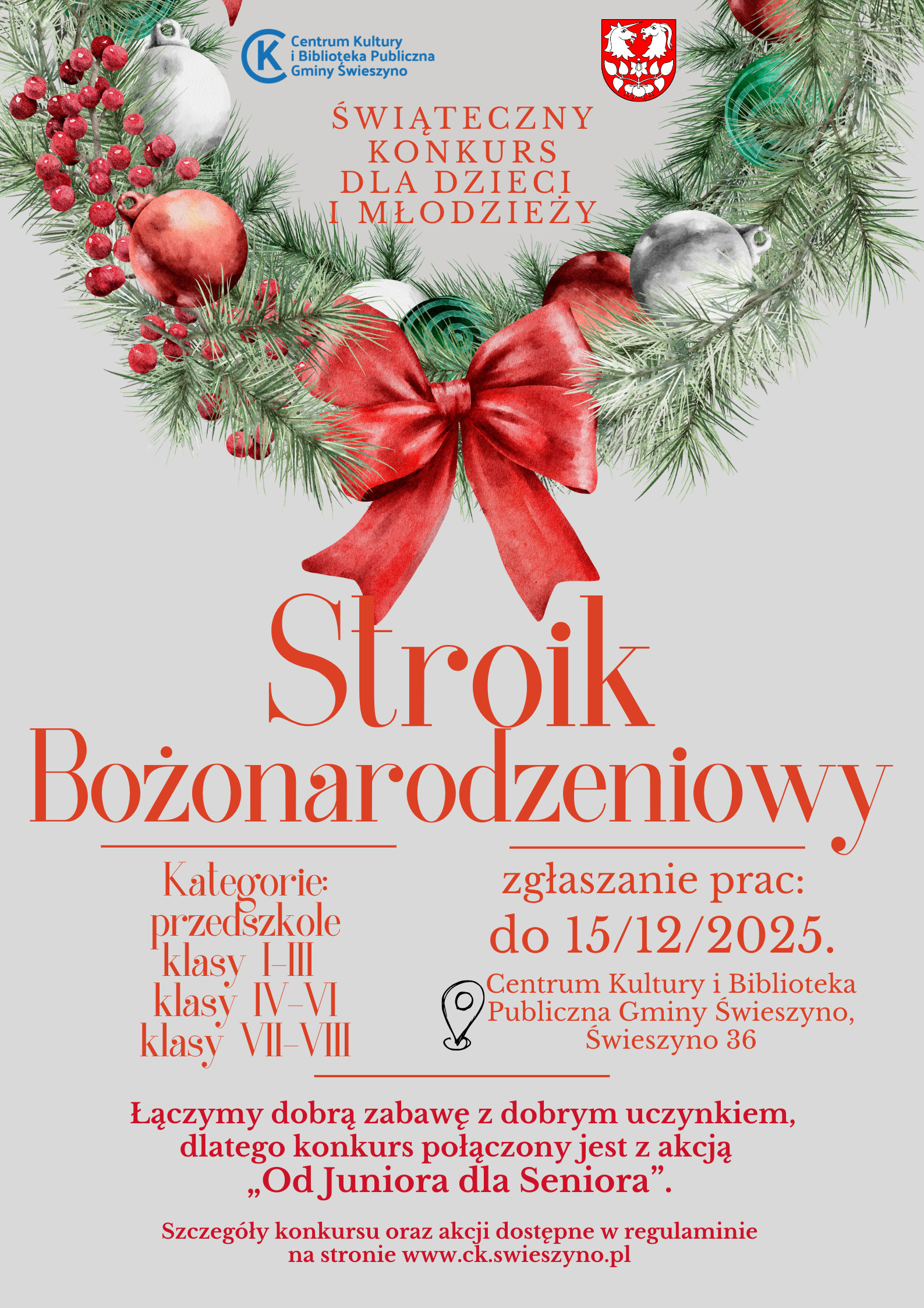 Serdecznie zapraszamy dzieci oraz młodzież do udziału w świątecznym konkursie plastycznym na najpiękniejszy Stroik Bożonarodzeniowy. To doskonała okazja by poczuć magię zbliżających Świąt, rozwijać sw...