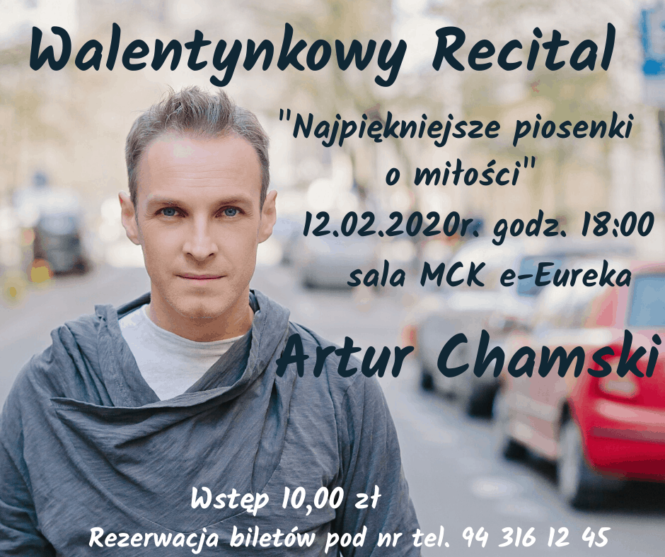 Zapraszamy na Walentynkowy Recital z Panem Arturem Chamski. Artur Chamski – aktor i piosenkarz. Od 2001 roku związany z warszawskim teatrem Studio Buffo. Uczestniczył w programach telewizyjnych tj. :„...