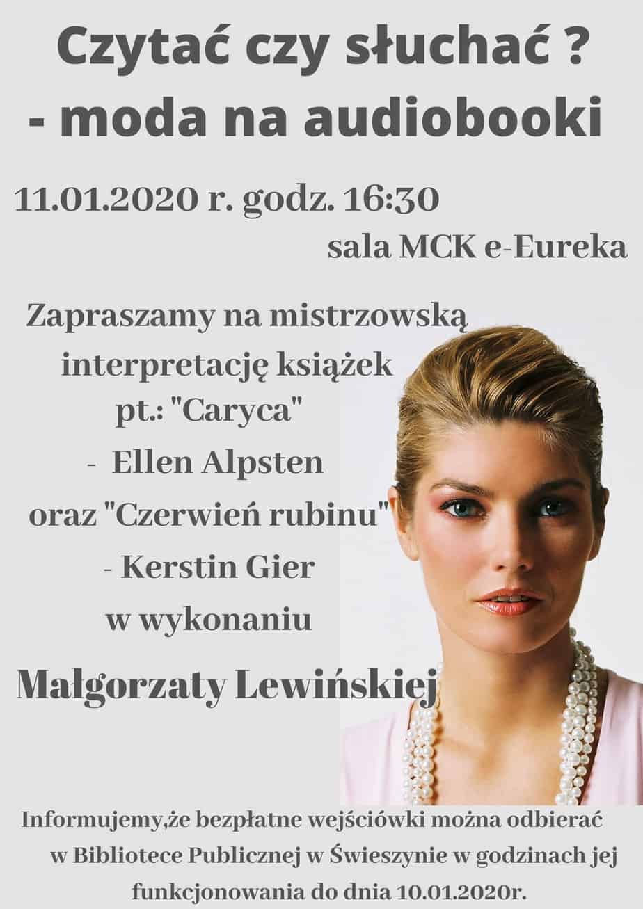 W sobotę tj. 11 stycznia 2020 roku w Bibliotece Publiczne w Świeszynie odbyło się spotkanie z Małgorzatą Lewińską pt.:” Czytać czy słuchać? – moda na audiobooki”. Książki do słuchania to c...