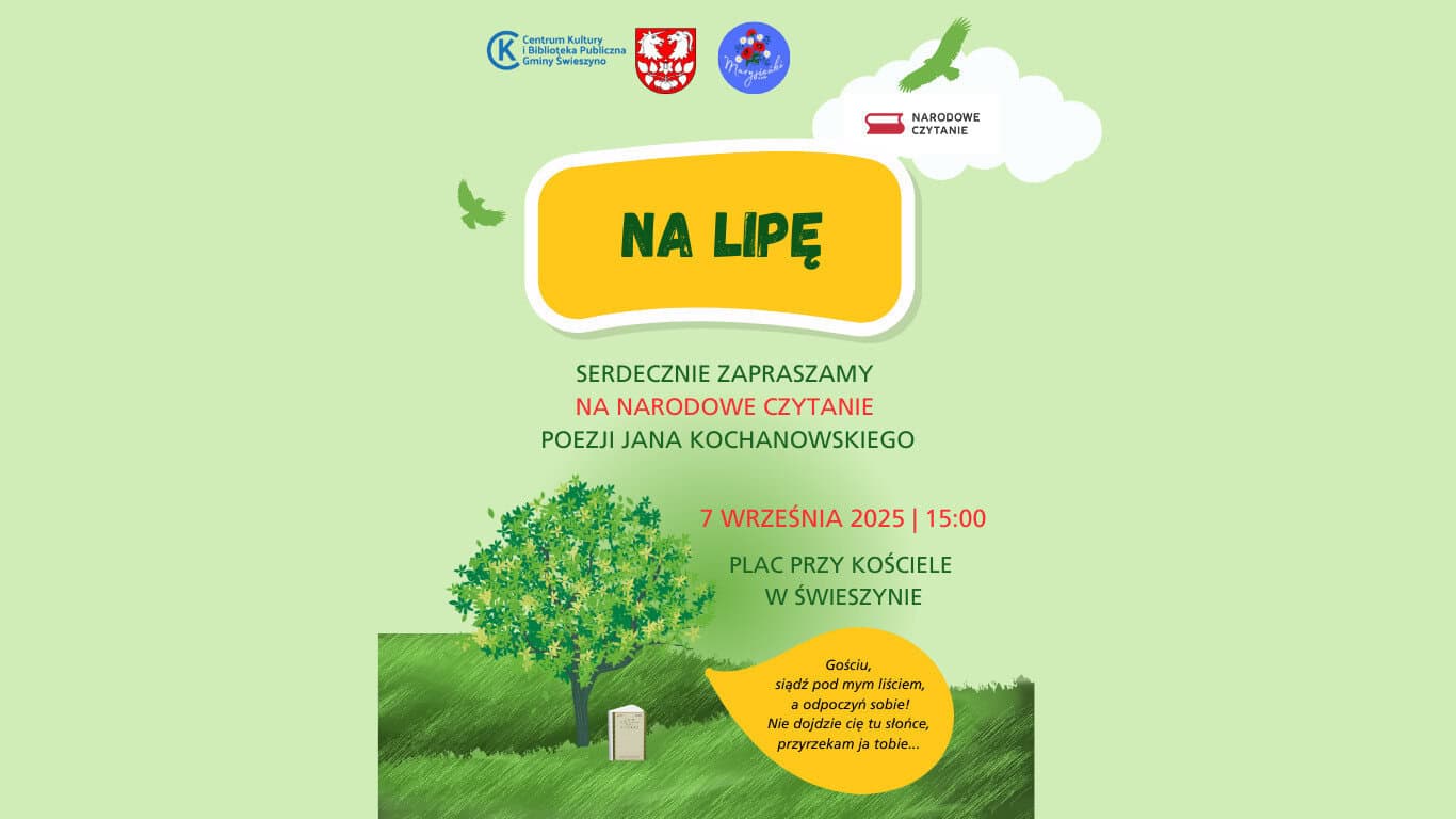 Serdecznie zapraszamy 7 września o godz. 15:00 na Narodowe Czytanie poezji Jana Kochanowskiego, które odbędzie się na placu przy Kościele w Świeszynie. Mamy dla Was literackie niespodzianki!...