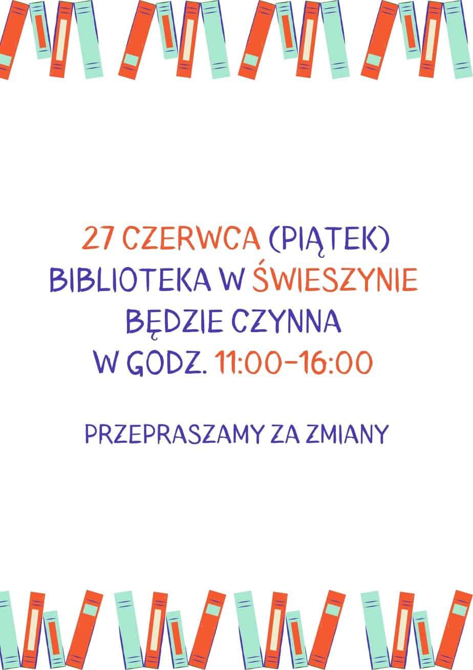 Informujemy, że jutro (piątek 27.06.) Biblioteka w Świeszynie będzie czynna w godz. 11:00-16:00. Przepraszamy za zmiany!...
