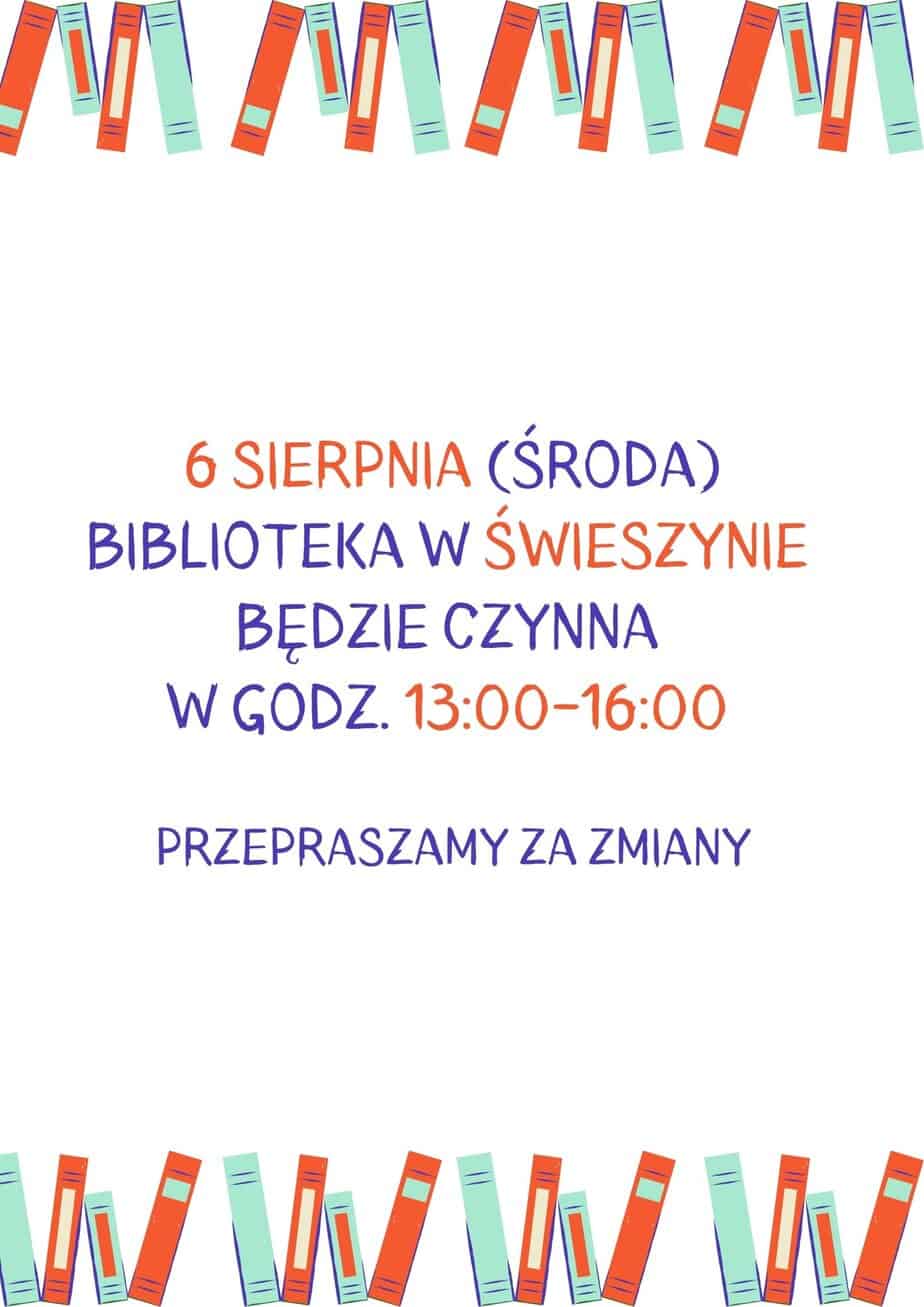 6 sierpnia (środa) Biblioteka w Świeszynie będzie czynna w godz. 13:00-16:00. Przepraszamy za zmiany....