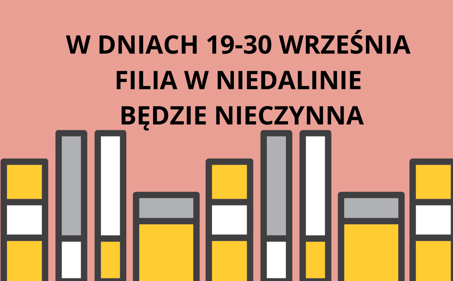 Drogie Czytelniczki, Drodzy Czytelnicy! Informujemy, że w dniach 19-30 września Filia w Niedalinie będzie nieczynna. W tym czasie Pani Alicja przebywa na urlopie. Zapraszamy do korzystania z bibliotek...