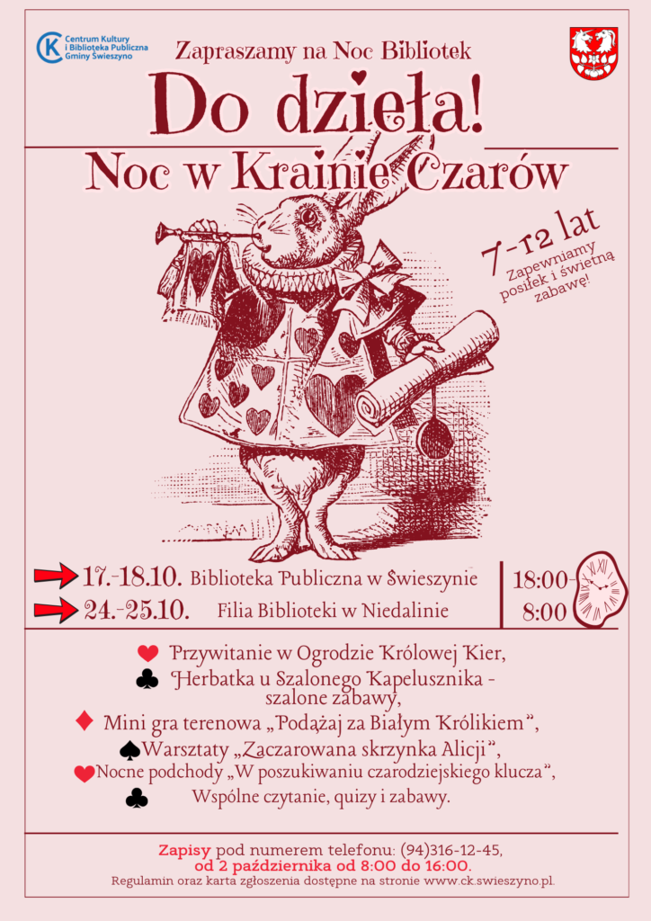 Czekają na Was: powitanie w ogrodzie Królowej Kier, herbatka u Szalonego Kapelusznika, gra terenowa „Podążaj za Białym Królikiem”, warsztaty, quizy, podchody i wspólne czytanie!